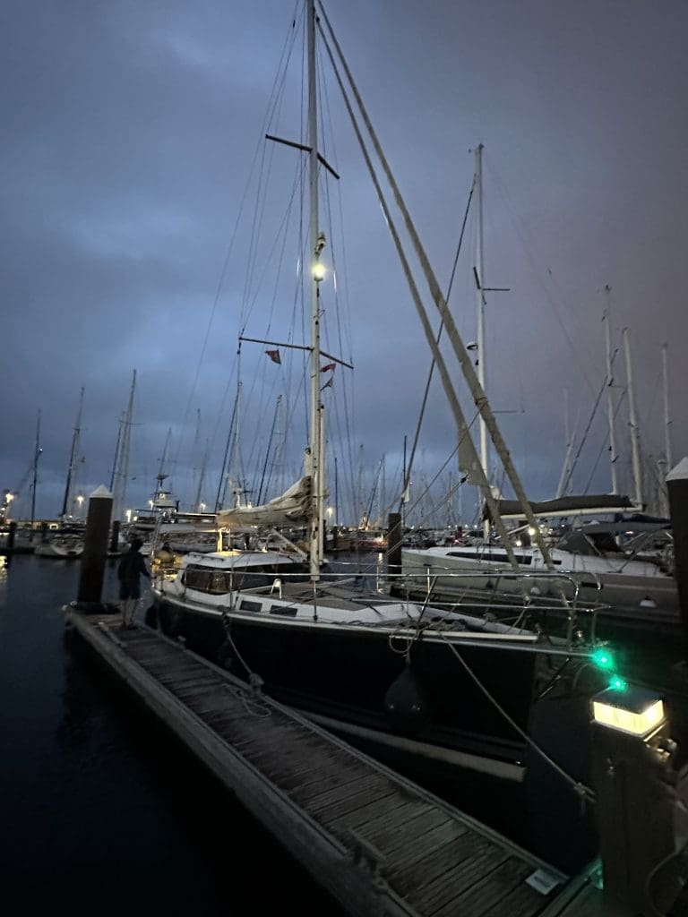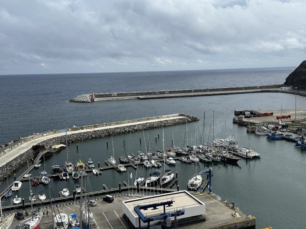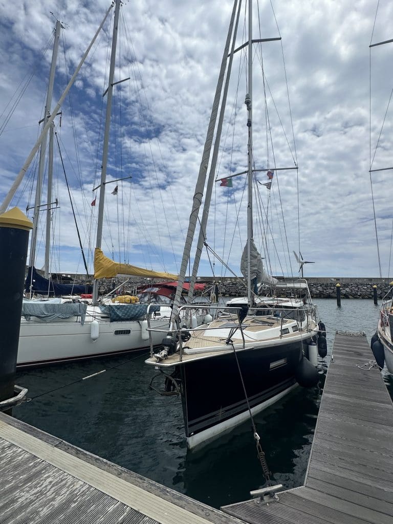 Wer nach Süden wollte, weg von den Azoren, hatte den Hafen längst verlassen. Wer jetzt weiter nach Norden möchte, also nach São Miguel oder zu der zentralen Inselgruppe, sitzt im Moment fest. Daraus ergibt sich eine angenehme Schicksalsgemeinschaft am Steg, in der man sich über die Zeit natürlicherweise kennenlernt. Wir werden noch Wochen später Segler wiedersehen, die wir hier das erste Mal trafen. So sind Jonas und Gitte unsere Nachbarn. Er ist Schwede, sie aus Dänemark, die während COVID einen 43’‑Eigenbau kauften und heute auf dem Atlantik unterwegs sind, meist zwischen den Kanaren im Winter und den Azoren im Sommer pendelnd. Das hat nicht nur klimatische Gründe, sondern auch steuerliche, da das Boot bei einem Aufenthalt von mehr als 183 Tagen in Spanien steuerpflichtig wird. Wir erfahren, dass es doch eine Menge Segler gibt, die auf diese Weise zwischen den beiden Inselgruppen wechseln und sich zwischendurch dann auf Madeira oder Porto Santo treffen, um einen Wetterstopp einzulegen.