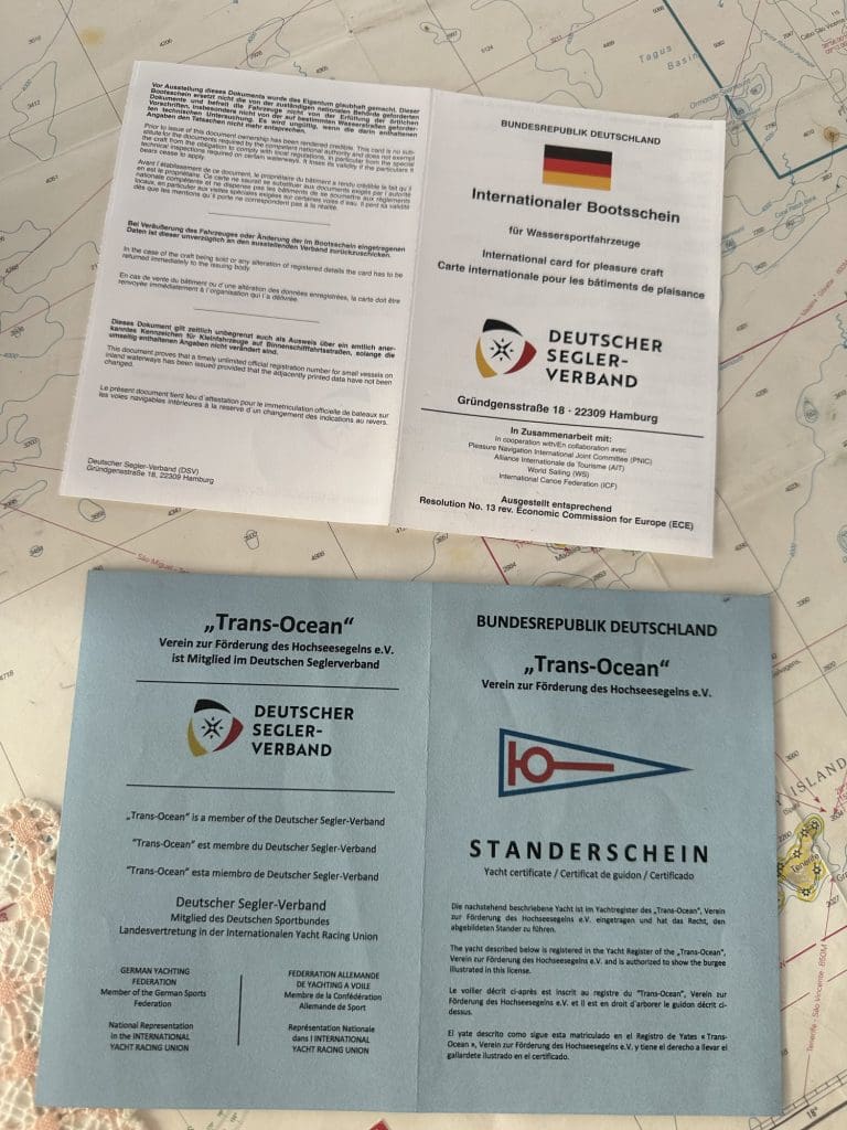 Oft wird für diesen Zweck einfach der Eigentumsnachweis verwendet, der auf verschiedene Art erbracht werden kann. Ich hatte dazu den Internationalen Bootsschein (IBS) vom Deutschen Seglerverband, der aber nach zwei Jahren abläuft und nach Einwurf von weiterem Geld dort verlängert werden muss. Auch wenn es nur 18 EUR sind, empfinde ich das als Geldmacherei und hatte keinen neuen Schein beantragt. Das Boot verändert sich ja nicht, sodass dies alle zwei Jahre aktualisiert werden müsste. Stattdessen lege ich den Standerschein meines Segelvereins Trans-Ocean e. V. vor. Der hat überhaupt keine offizielle Bedeutung, aber auch kein Ablaufdatum, dafür jedoch Stempel, Unterschrift, den Schriftzug Bundesrepublik Deutschland und schweres Ausweispapier, womit er bedeutungsvoll aussieht. Das hat in Kombination seither immer alle glücklich gemacht.