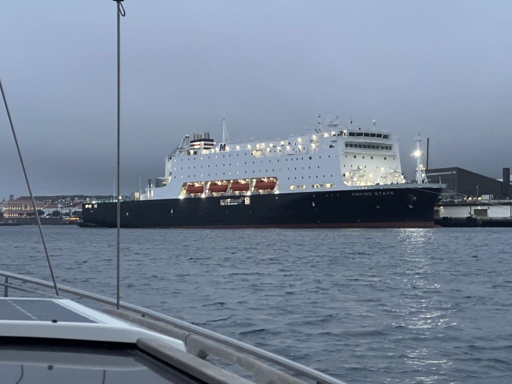 Der große Hafen von Ponta Delgada öffnet sich vor uns gegen Mitternacht, was 12 Stunden für unseren Transit bedeutet. Im Eingang liegt ein gigantisches amerikanisches Schiff, von dem noch die Rede sein wird. Selbiges umrunden wir und erreichen die große Steganlage der Marina dahinter.