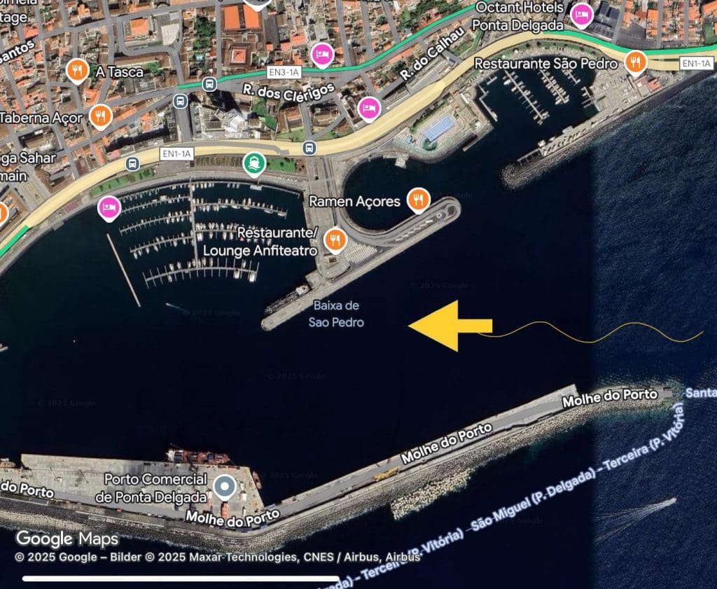 Die Marina in Ponta Delgada hat, wie angedeutet, einen miserablen Ruf. Genauer gesagt die neue Marina im Westen. Man hat die riesige Anlage dort hinter das Kreuzfahrtterminal gebaut, welches die Steganlage gegen Ostwind und Wetter aus der Richtung schützen soll. Leider hat man aber das Terminal auf Stelzen gebaut. Das ist natürlich sehr viel günstiger, dafür lässt es so aber einen bedeutenden Teil des Atlantikschwells unter sich durch und trifft danach auf die Marina, wo es bei Schwell aus Osten regelmäßig zu extremer Bewegung und folglich zu Bruch bei Booten und Steganlage kommt. Wenn die Wetterlage dann so ist, muss es fruchtbar sein. Der alte Hafen im Osten dagegen ist wesentlich besser geschützt, normalerweise aber den Einheimischen vorbehalten.