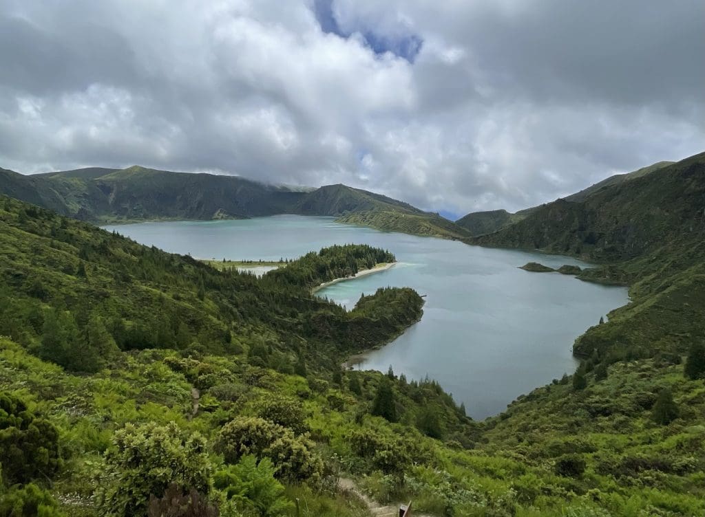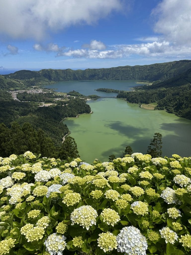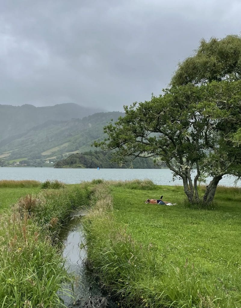 Nach der Weltenrettung begeben wir uns hinab nach Sete Cidades zu den Seen, wo das Wetter durchwachsen ist und es immer wieder leicht regnet. Wir denken uns das Ganze schön, da es immerhin nicht > 40 °C hat, sodass wir uns vor der Sonne verstecken müssten. Das Klima ist doch insgesamt sehr belebend, nicht kalt, und die Natur saftig grün. Passt also! Wir laufen hier kurz herum und fahren weiter.