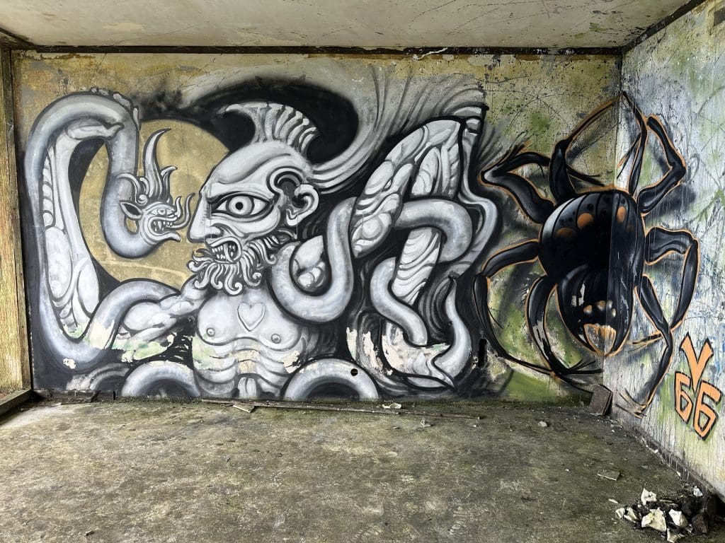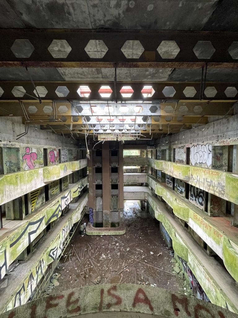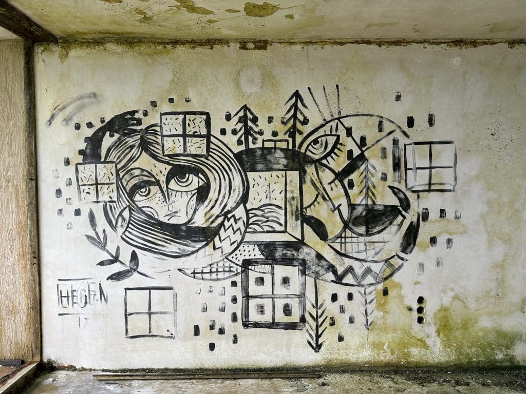 …nehmen wir die Treppe, vorbei an den Verbotsschildern, die die Besucher der verlassenen Hotelruine auffordern, genau das nicht zu tun, was sie gerade tun.