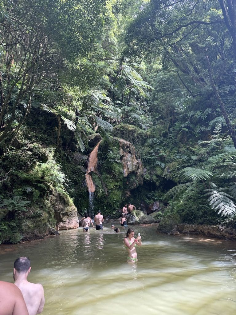 Als Nächstes steht der Besuch in dem Meeresschwimmbad Ponta da Ferraria bei Ginetes auf dem Programm, das es so vermutlich nicht häufig auf der Welt gibt. Eine 60 °C heiße Quelle ergießt sich hier so ergiebig in eine kleine Bucht, dass das Wasser beim Schwimmen darin deutlich wärmer ist, als es nach der Wassertemperatur des Ozeans sein dürfte.