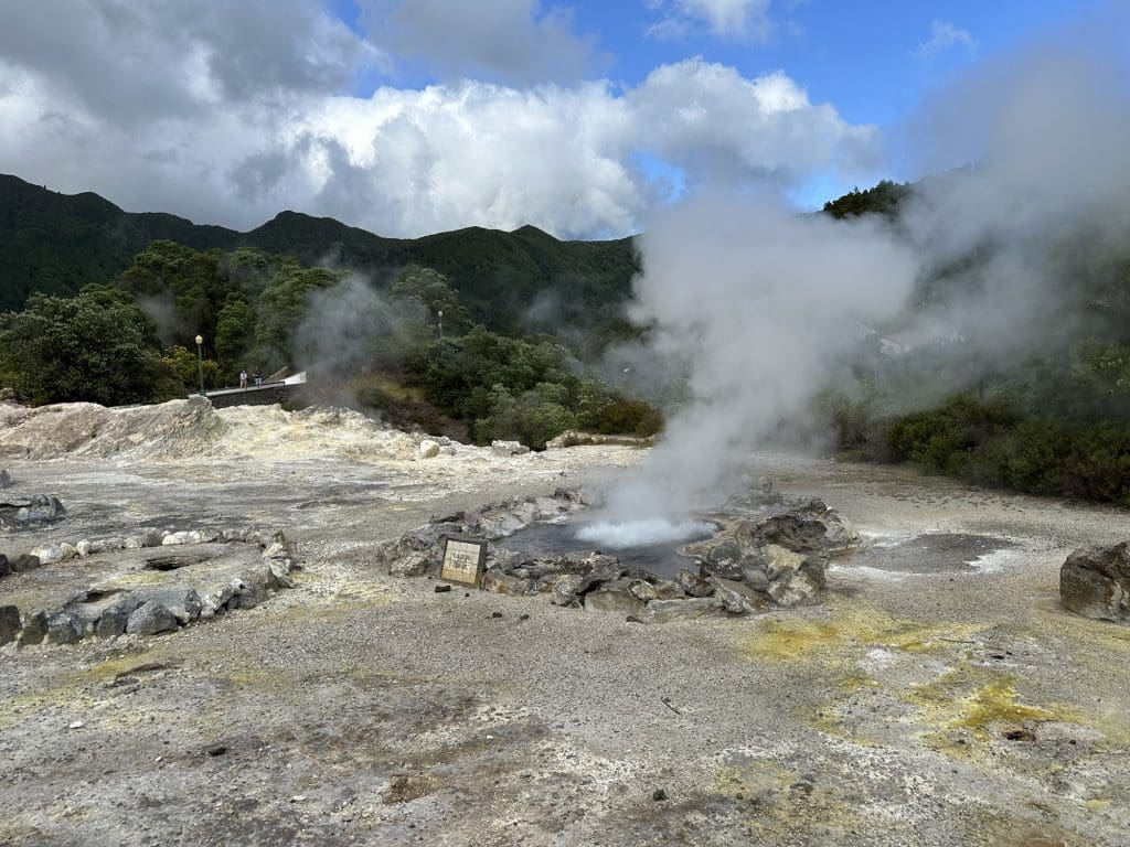 Es ist ohnehin Tischzeit und wir verlegen zu den Caldeiras das Furnas, einem kleinen Geothermalgebiet, in dem es nur so brodelt und schweflig dampft.
