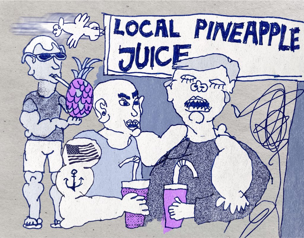 Nach dem Essen wenden wir uns den anderen Ständen zu, die mit lokal angebauter Ananas und den daraus erstellten Getränken werben. Überall auf der Insel gibt es Stände dieser Art. Filip kommt mit den beiden freundlichen Damen ins Gespräch. Sie erzählen, von welchen Inseln sie kommen und welche sie selbst schon besucht haben, was bei weitem nicht alle sind, obwohl sie hier leben. Filip fragt, ob die Ananas wirklich von der Insel kommt, was verneint wird. Diese kämen aus Costa Rica, und die als lokal beworbene Ananas gibt es zwar, sie ist aber viel kleiner und teurer und wird nur auf Anfrage geschnitten verkauft. Für die Piña Colada oder den Ananassaft nehmen sie immer die ausländische. Wenn schon, denn schon, sagen wir uns, nehmen sie und futtern desillusioniert, weil eine größere Ananas, die von so weit herkommt, immer noch günstiger ist als die lokal angebaute. Wir retten die Welt, indem wir über entsprechende Konzepte diskutieren, die das heilen.