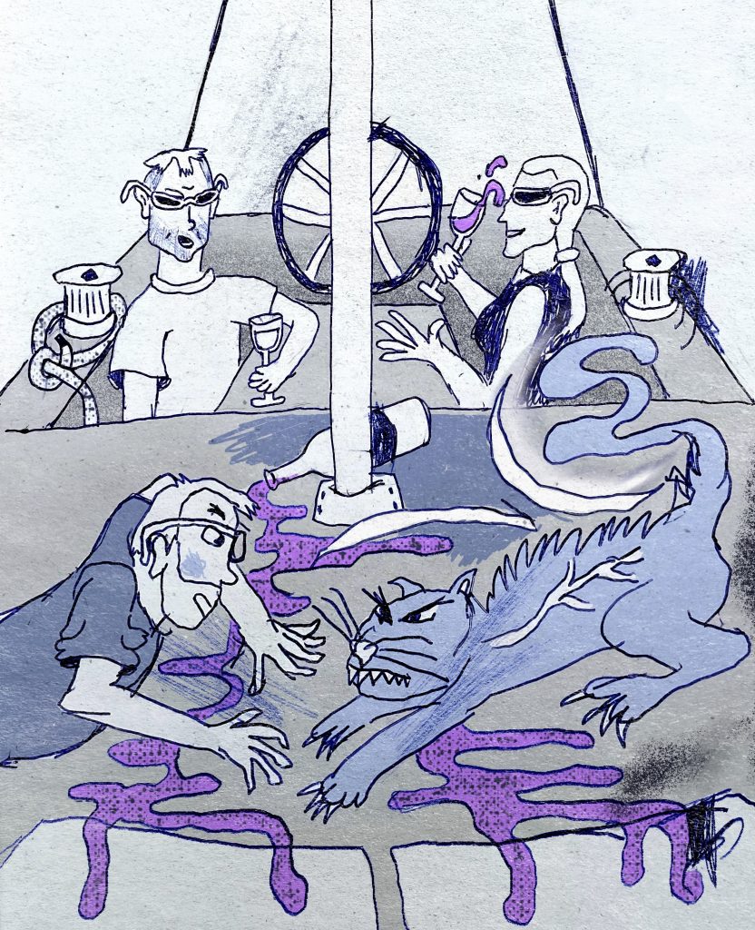 Ich ziehe mich zu meinem Rotweinglas und in die Sicherheit von Cockpits und der dortigen Gesellschaft zurück und versuche weiterhin, mein Glas auszutrinken. Alleine, es möchte mir nicht gelingen. Sobald der Füllstand sich dem Bereich des Bodens annähert, kommt die Flasche vorbei und füllt es wieder auf. Eine leere Flasche wird sofort gegen eine neue ausgetauscht, die ein ums andere Mal aus den Eingeweiden der Yacht zum Vorschein kommt, wie auch Rauch und ein Feueralarm, welche beide von dem anbrennenden Essen verursacht werden, das Gitte dort unten erst missachtet und dann versucht zu retten.