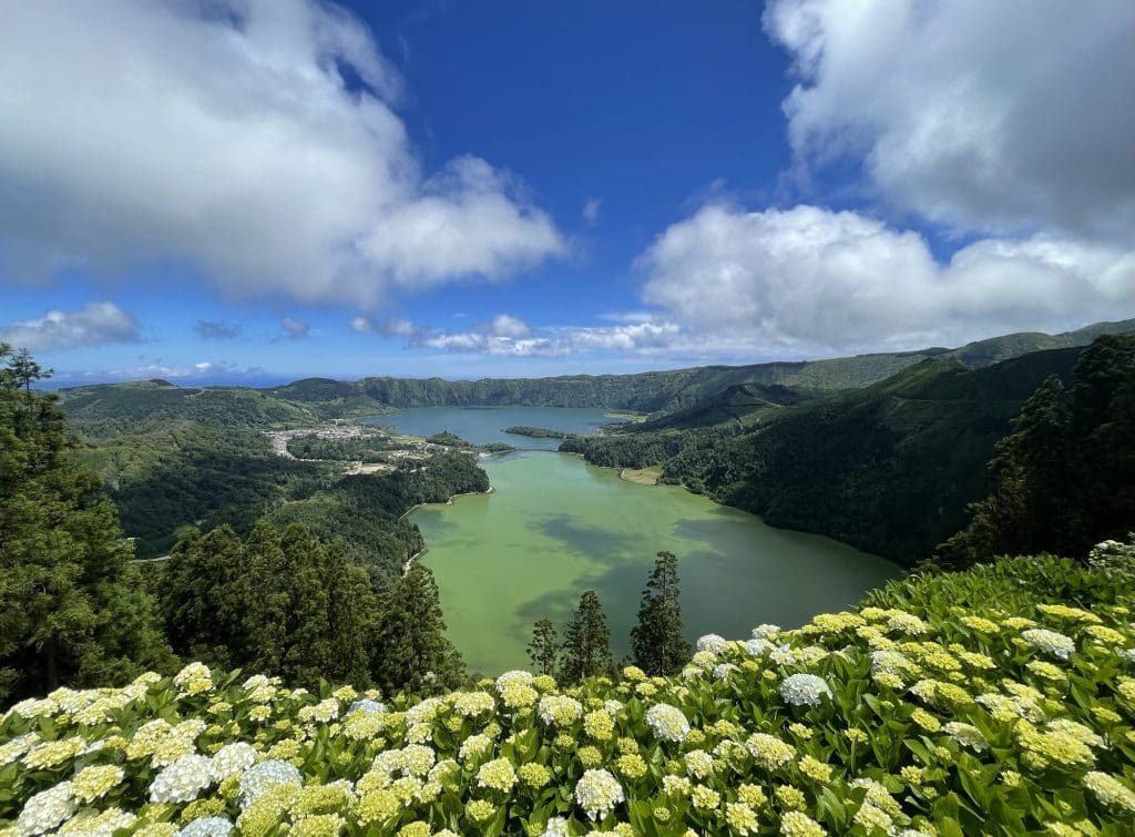Unser erster Inselhöhepunkt sind die Lagoa das Sete Cidades beim Miradouro da Vista do Rei. Hierbei handelt es sich um zwei Kraterseen, deren unterschiedliche Färbung eine Sage begründet, die von den Tränen einer herzzerreißenden, unerfüllten Liebe zwischen zwei jungen Liebenden aus verschiedenen Ständen herrührt, die sich nicht lieben dürfen. Der Anblick ist in jedem Fall äußerst beeindruckend, ein fotografisches Sinnbild der Azoren, und gehört auch in unsere Top 10 der Azorenhighlights.