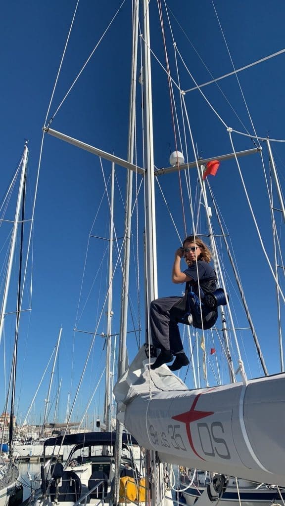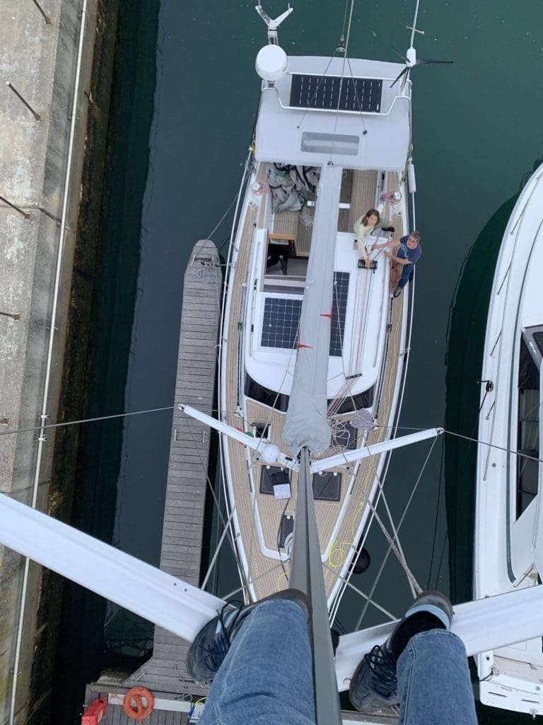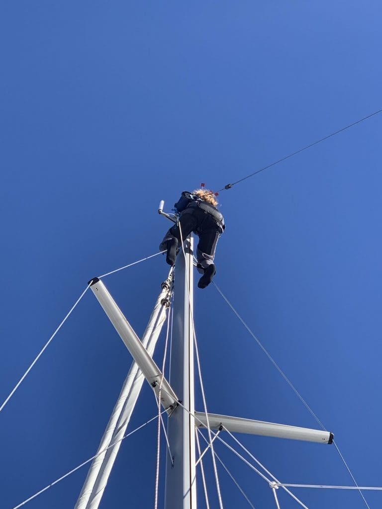 Außerdem nehmen wir den Mast und das gebrochene Code Zero Fall in Augenschein. Das bedeutet, dass ich und Filip das erste Mal in den Mast und nach oben müssen. Da wir keine begehbaren Wanten haben, so wie das auf Windjammern der Fall ist, ziehen wir uns mittels der Elektrowinsch in einem sogenannten Bootsmannstuhl nach oben. Ich will da unbedingt rauf, muss aber kurz vor der Spitze aufgeben. Ich probiere es dann mal später wieder, bis ich es kann. Markus, dem ich vorher bei sich an Bord nach oben geholfen hatte, kommt auch vorbei und hilft bei uns, das schafft Sicherheit.