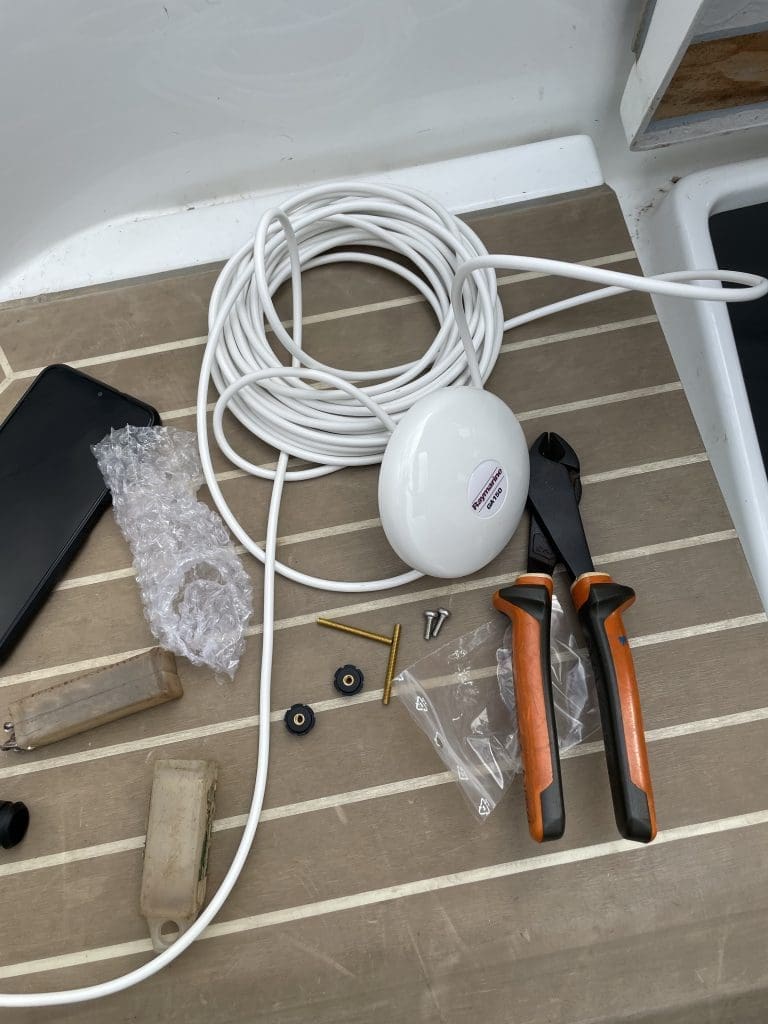 Die eigentliche Installation ist super einfach. Die GPS Antenne wird über das mitgelieferte Koaxial-Antennenkabel einfach an einen der Plotter hinten angeschraubt. Dafür hätte ich niemanden gebraucht. Auch das Bohren des Loches und Abdichten hätte ich noch hinbekommen. Aber das Ziehen des Kabels war eine Herausforderung, an der die Profis beinahe gescheitert währen. Der Kabelkanal ist eben schon recht voll und der Stecker ziemlich dick. Somit bin ich froh, dass ich das nicht selbst und ohne deren Equipment machen musste.
