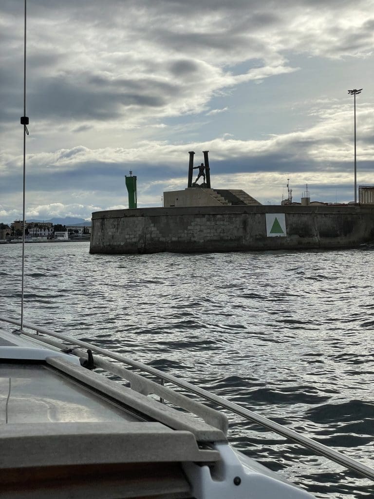 Mein ruf an die Marina auf UKW wird nicht beantwortet. Wir sind nicht angemeldet und das Hafenbüro ist bereits geschlossen. Der Rezeptionspier ist ein außerordentlich ungastlicher aussehender Abschnitt neben der Tankstelle, da will ich nur im Notfall hin. So kurven wir sehr langsam suchend durch den Hafen, dann pfeift es irgendwo. Beim zweiten Pfeifen sehe ich jemand, das könnte uns gelten. Ich fahre in die Richtung, Filip sucht noch, was ich meine. Tatsächlich ist es der Marinero, der uns beim Anlegen hilft. Römisch-Katholisch natürlich, wie sich das im Mittelmeer später durchgängig so gehört, also mit Mooring und das Heck zum Pier.