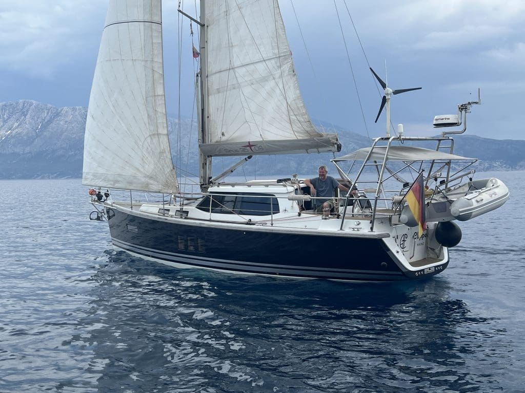 Auch das wird einen spürbaren Effekt auf meine Energiebilanz haben, wie sich bald herausstellt. Dies sollen die letzten notwendigen Maßnahmen sein, ich bin startklar. Am nächsten Morgen kommen die Eigner von Amazing Grace an, Henning und Sylvia. Wir essen eine Kleinigkeit zu Mittag, ich mag die beiden sofort, aber wir haben nur kurze Zeit zusammen. Mein nächstes Meeting ruft mich in das Vorschiff an den Computer. Als ich fertig bin, sind die drei mit der Amazing Grace bereits unterwegs zu ihrer Ankerbucht.