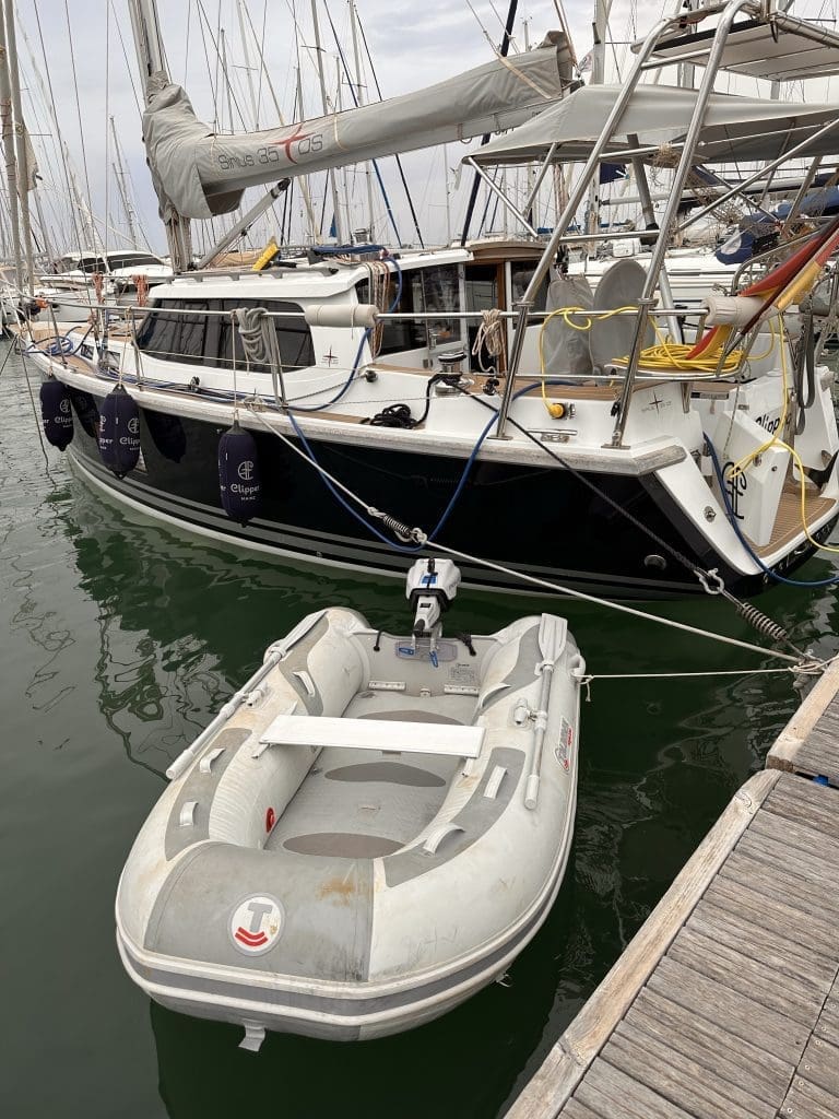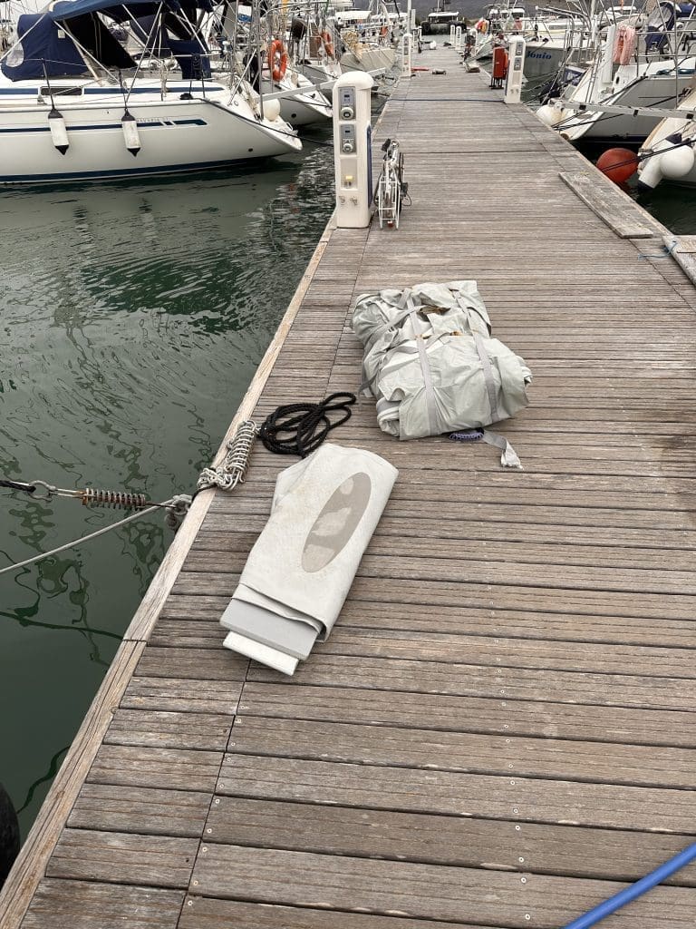 Eine letzte Heldentat vollbringe ich, indem der Clipper einer gründlichen Außenreinigung unterzogen wird. Mal wieder hatte der Regen in den vergangenen Wochen viel Saharasand auf dem Oberdeck abgelegt. Ich fahre sogar mit dem Clipperchen um den Clipper herum und wische den polierten Rumpf ab.