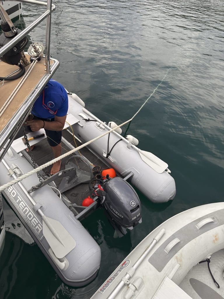 In dem Moment verlassen die Nachbarn mit dem Dinghy ihren Katamaran. Ich fackele nicht lange und frage freundlich an, ob sie mir eben die Leine an Land fahren und dort belegen können. Das können sie und ich bin das erste Mal mit Landleine am Ufer fest. Der gute Zufall war hier mit dem Wagemutigen.