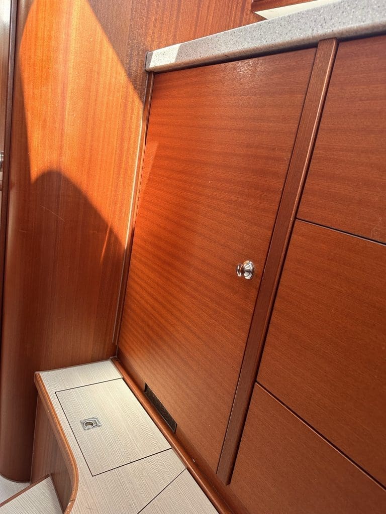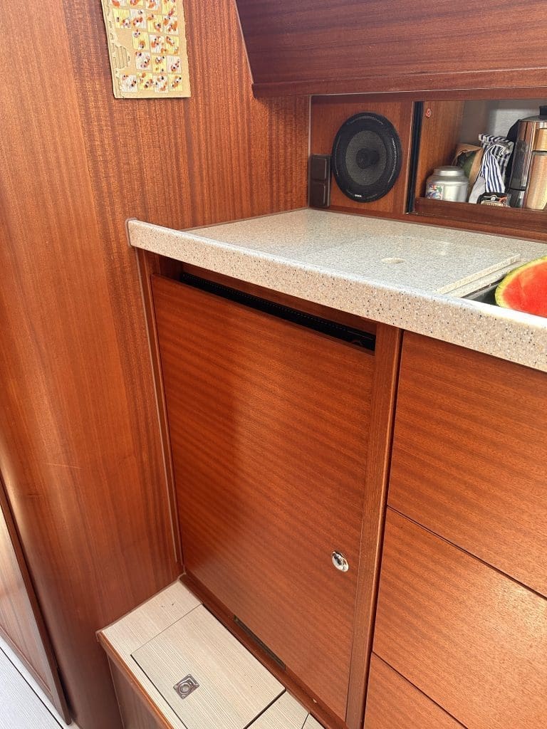 Ich bin jedenfalls schon sehr glücklich, da setzten wir noch einen obendrauf. Als der Kühlschrank letztens kaputtging, hatte ich Strom im Überfluss. Wir messen den Strombedarf des Geräts, der aber in Ordnung ist. Dann bleibt nur, dass das Ding zu viel läuft, was wiederum daran liegen muss, dass er seine Wärme nicht los bekommt. Torsten weiß zu berichten, dass man mittlerweile deutlich mehr Lüftungsmöglichkeiten in den neuen Booten ab Werft schafft, auch wenn hinter dem Kühlschrank alles offen ist und das Seewasser den Rumpf von außen kühlt, an dem die Luft entlang streicht. Wir entscheiden, die Holztür vor dem Kühlschrank zu kürzen, sodass er an dieser Stelle die warme Luft besser los bekommt.