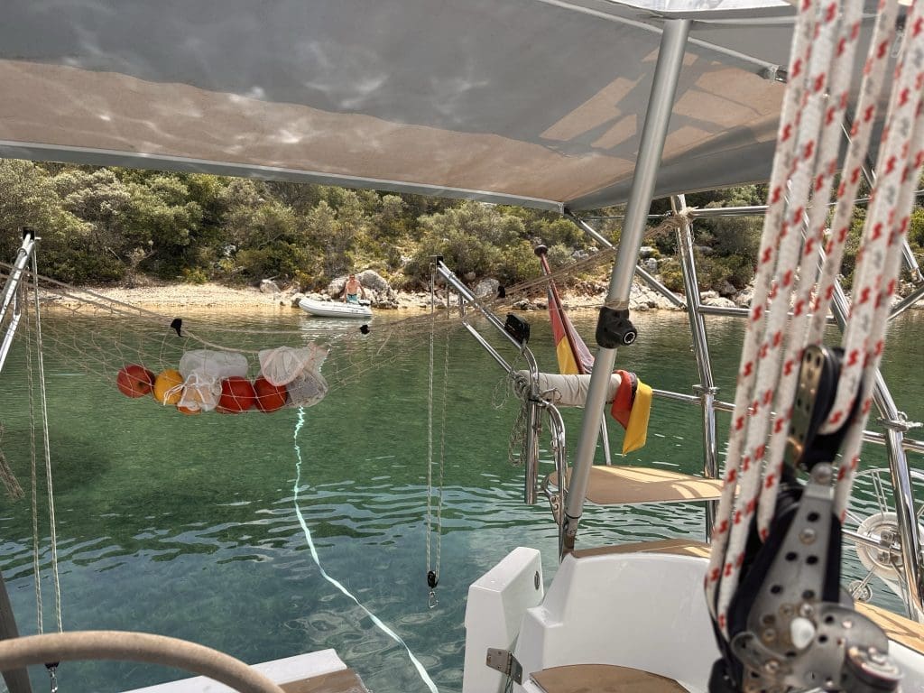 Weiter geht es am kommenden Morgen zur besagten Bucht. Als ich dort einlaufe, ist die Lage durchmischt. Erst fahre ich an den Seglern vorbei, die dort mit Landleine am Ufer liegen. Ich habe mich dafür sogar vorbereitet und eine lange Rolle Seil herausgelegt, mit der ich das Heck an einem Stein oder Baum fest machen kann, während der Bug durch den vorher ausgebrachten Anker gehalten wird. Der Wind kommt allerdings schwach von der Seite. Der Clipper würde mir auf den Nachbarlieger treiben, während ich mit dem Clipperchen und der Leine in der Hand auf dem Weg zum Ufer wäre.