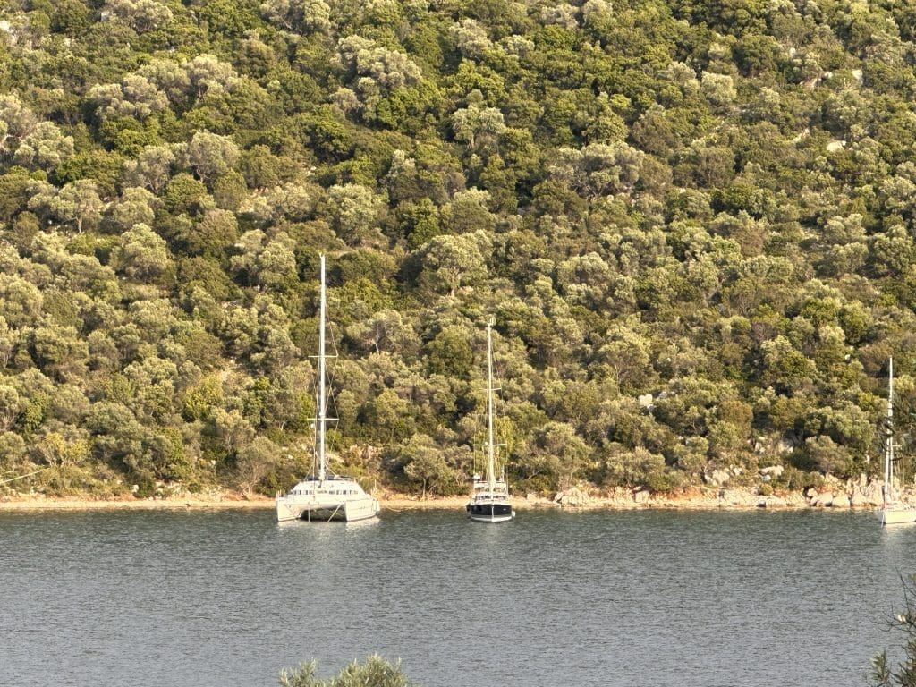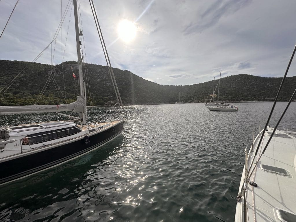 Ich drehe noch einmal einen größeren Bogen und komme erneut an den Booten vor Landleine vorbei. Der Wind hat jetzt gedreht, und weht leicht auflandig. Das ist genau das, was ich benötige, um das erste Mal dieses in Griechenland, aber auch in der Ostsee, sehr gebräuchliche Manöver zu versuchen. Der Umstand, dass ich allein bin und niemand auf dem Clipper die Position halten wird, während auch dem Weg an Land sein werde, lässt mich zwar eine gewissen Aufgeregtheit verspüren, aber ich möchte da mal durch. Ich lasse den Anker auf Grund fallen, fahre langsam rückwärts und gebe dabei Kette. Ich spüre, wie der Anker greift und das Boot verlangsamt. Schon mal gut!