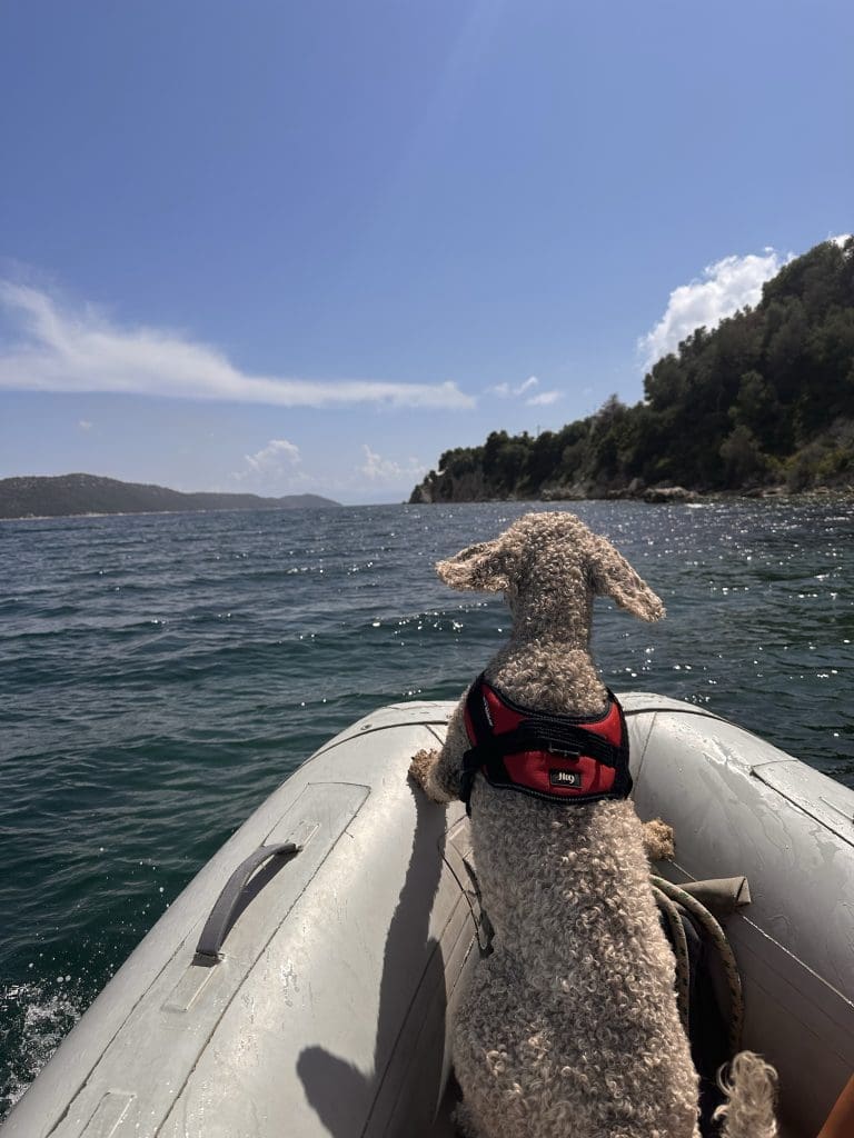 Wir kommen wenig später ins Gespräch und schließen uns ins Herz. Mathias und Isabel sind sehr erfahrene Segler, was man aber weniger daran erkennt, dass man es auf die Nase gebunden bekommt, sondern mehr an Nebensätzen oder im Gespräch. Angenehm unprätentiös. Ich spitze jedenfalls die Ohren und lerne. Die beiden haben in Deutschland einen Teilzeitarbeitsvertrag, können so mit dem Segen ihrer Arbeitgeber am Stück mehrere Monate im Jahr auf dem Boot verbringen und nutzten außerdem ein Sabbatical für eine Atlantikrunde. Ich schließe weiterhin Freundschaft mit ihrem verkuschelten Anhang, der Hündin Pita.