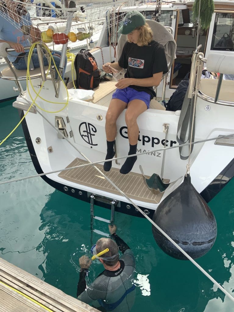 In der Marina Santa Cruz geht das gar nicht. Hier greifen die Regularien des Industriehafens, und Taucher dürfen nicht alleine ins Wasser und brauchen einen dritten Mann als Sicherung an der Oberfläche. Für Arbeiten etwa 1 Meter unter Wasser an einer Segelyacht ist das der zig – fache Sicherheits-Overkill und dadurch völlig unbezahlbar.
