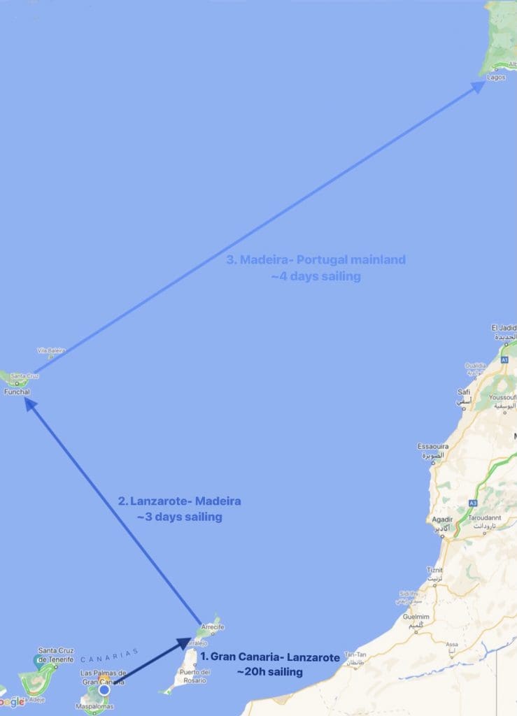 Das Wetter für das kommende Wochenende sieht Nord-Ostwinde mit um die 15 -20 Knoten vor. Später auch in Böen 25 Knoten bei 1,5-2 Meter mittlerer Wellenhöhe. Das ist zwar nicht gerade wenig, aber für die Windrichtung sind wir hier hergefahren, die passt gerade so. Montag im Laufe des Tages sollen wir ankommen. Lanzarote und Madeira sind im Prinzip so etwas wie riesige Kreuzschläge gegen den vorherrschenden Nordwind. Filip hat mal eine schöne Zeichnung gemacht, die der Plan die kommenden Wochen zurück aufs Festland aussieht.
