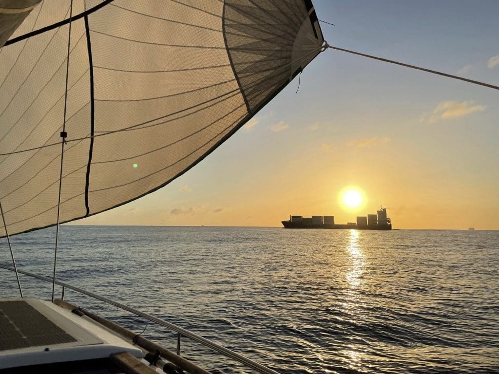 So ein Wetter hätte ich für die Überfahrt mit unserem Gast Christian von La Palma nach Gran Canaria gebraucht! Sanft und gutmütig wiegt sich der Clipper in der niedrigen und lang gezogenen Atlantikdünung, gleitet ohne viel Rollen und stampfen dahin, wie er das im Atlantik sonst gerne macht. Sonne satt. Wir haben zwischen 7 und 10 Knoten Wind, ziemlich das untere Ende, zu dem wir mit unserem Boot noch vernünftig mit immerhin 4 – 5 Knoten vorankommen. Dazu ein Traumstart mit eindrucksvollem Sonnenaufgang am Morgen.