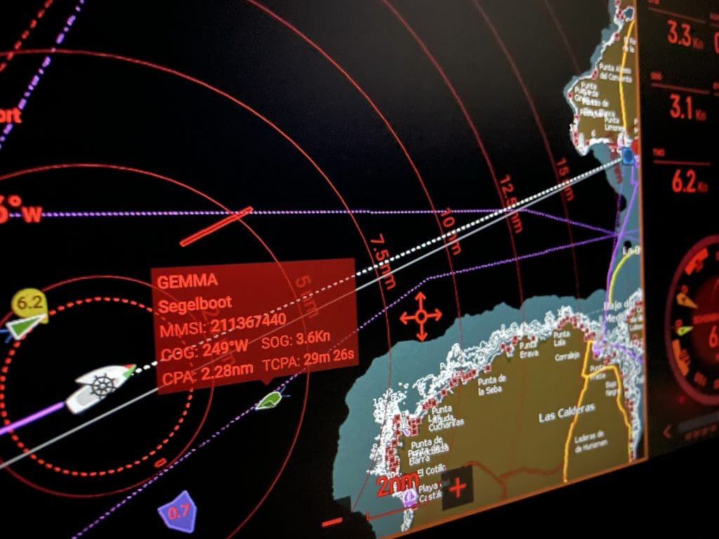Am Abend haue ich mich noch mal hin, Filip übernimmt bis etwa 23 Uhr, dann bin ich für den Rest der Nacht dran. Wir hätten bei 5 Knoten Fahrt auch gegen 2 Uhr ankommen können, da wir aber bei dem schwachen Wind durchaus gemächlicher unterwegs sind, wird das nichts. Ich beschäftige mich mit dem Verkehr um mich herum, es ist doch schon einiges los. Zwei Frachter, die von Achtern aufkommen und uns überholen. Ein anderer Segler, der uns seit Las Palmas de GC begleitet und immer näher kommt. Den muss ich ständig im Auge behalten, dass der keine Dummheiten macht. Und die macht er, indem er mitten in der Nacht etwa 2 Meilen querab sehr komische Manöver fährt. Na ja, wenn er ein Problem hat, wird er sich schon melden. Bald kommt er mit Abstand wieder hinterher, um so besser. Dann kommt uns noch die deutsche Segelyacht GEMMA entgegen, an der ich irgendwo schon mal in irgend einem Hafen ständig vorbeigelaufen bin. Jedenfalls erinnere ich mich an den Namen, nicht aber den Hafen. Vielleicht Lagos.