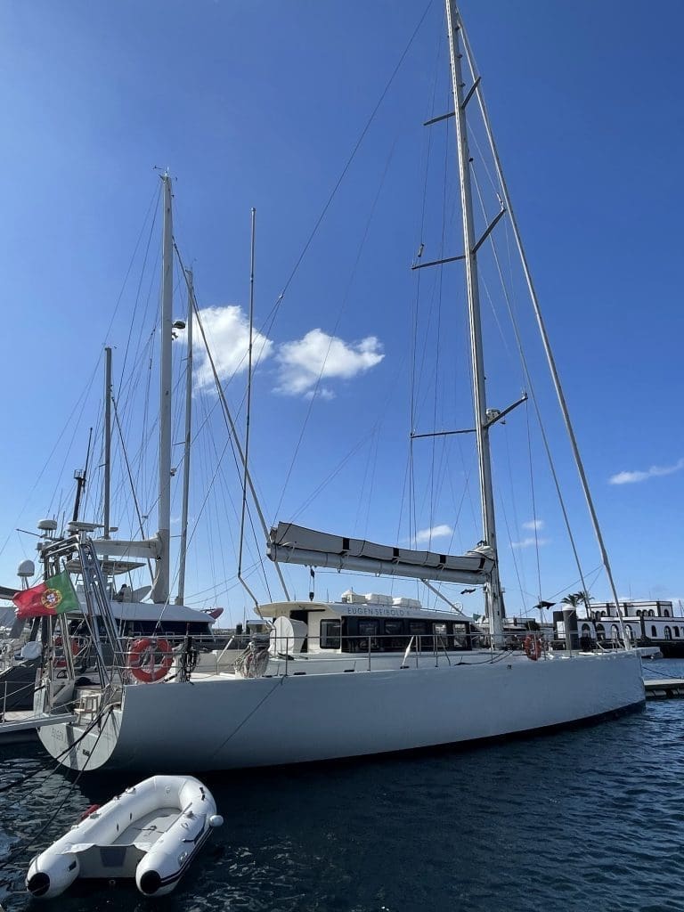 Schräg gegenüber liegt die unter portugiesischer Flagge fahrende riesige Yacht Eugen Seibold. Das ist eine Deckssalongyacht für die ganz großen Jungs vom Max-Planck Institut für Chemie, die damit weitestgehend emissionsfrei auf Forschungsexpeditionen auch in Polare Regionen fahren. Der Look hat es mit angetan, das Ding ist vermutlich in engen Stellen sehr unhandlich und ggf seglerisch nicht immer top, aber beeindruckend ist es allemal.