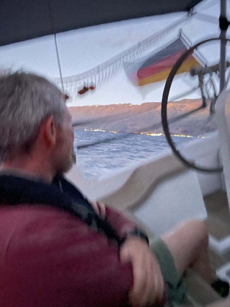 Wir kommen so unter den allerbesten Bedingungen an der Südspitze La Palmas an. Wir halten uns westlich Richtung Tazacorte, hier haben wir noch mal einen deutlichen Kap-Effekt und ich muss für 10 Minuten die Genua gegen die Fock tauschen. Dann schläft der Wind 1,5 Stunden vor dem Hafen ein und das, was von dem Wind übrigbleibt, kommt von vorne. Für die Zeit haben wir allemal genug Diesel und somit geht es unter Maschine weiter.