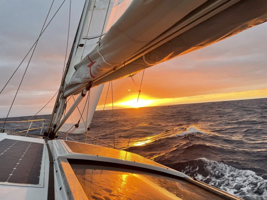 Eine Stunde segeln wir in den Sonnenaufgang und sind zunehmend romantisch. Dann wende ich und ich stelle den Windfahnenmodus des Autopiloten auf 55 Grad zum Wind ein. Meine Taktik soll heute besser werden, als bei dem Weg nach La Gomera, wo ich jedes Grad zum Wind geschunden hatte. Ich will mit komfortablen Winkeln zum Wind kreuzen und nicht zu hart an denselben gehen. Tatsächlich aber liegen wir nun mit unserem Kurs ziemlich genau so, wie wir es auch brauchen. Wenn es dabei bleibt, können wir von hier direkt Kurs halten, auf die Südspitze von La Palma. Das wäre gigantisch gut!
