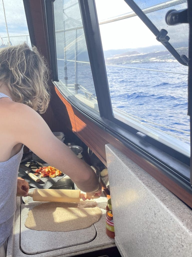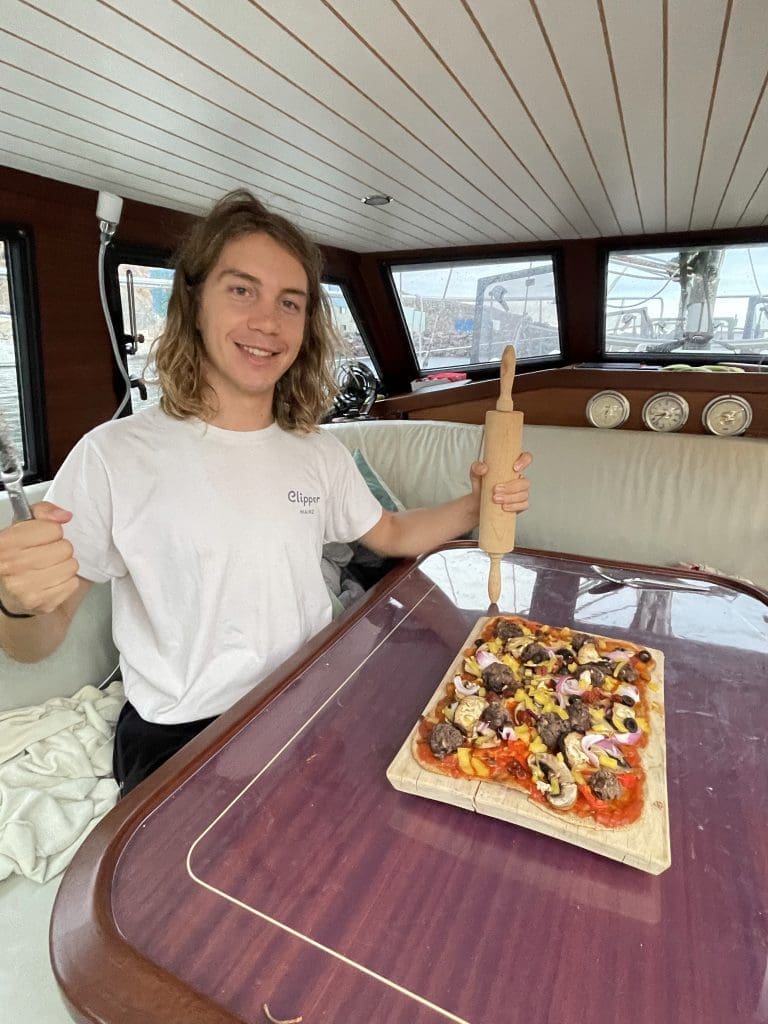 Wir sind kurz vor dem Hafen und ich muss sogar noch aufstoppen und die Maschine dann ganz abstellen. Grund ist aber kein technisches Problem, sondern Filip. Der fand die Bedingungen so gut, dass er Pizza gemacht hat,