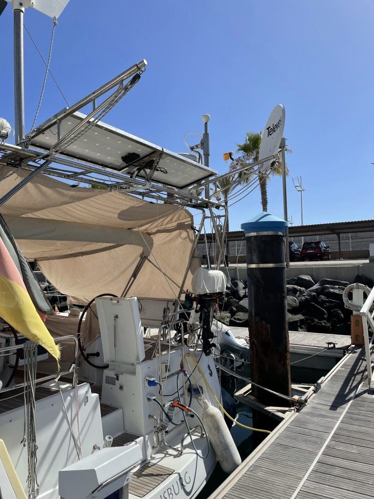 Am Steg existiert eine sehr freundliche und hilfsbereite, meist deutsche Gemeinde. Der Nachbar, zwei Schiffe weiter, baut sich gerade ein Haus auf La Palma. Mit seinem Boot ist er hier auch bereits fest eingezogen. Die Antenne für das Satellitenfernsehen ist schon auf dem Poller für die Steganlage montiert, damit sie sich nicht mit dem Boot bewegt. Die Wasserleitung gleicht ebenfalls schon mehr einem Festanschluss, als einem Provisorium. Der Sonnenschutz ist perfekt den lokalen Gegebenheiten angepasst. Die Marina kommt einem Campingplatz schon sehr nahe. Der Nachbar hier hat sinnbildlich seinen Karavan schon aufgebockt und die Räder abgeschraubt. Zumindest ist es so gut eingerichtet, auch wenn er wahrscheinlich mit drei Handgriffen loswerfen kann.