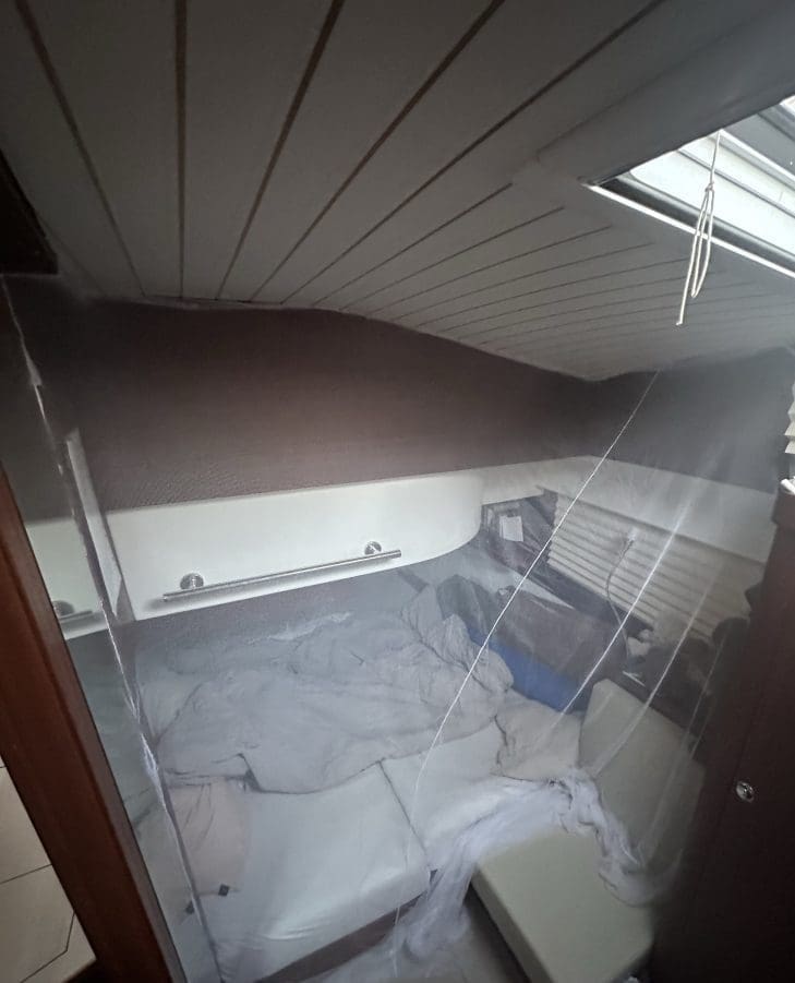 Stechmücken gibt es natürlich auch hier, wir haben allerdings jetzt schon seit Längerem eine hocheffektive, weitere Verteidigungslinie gegen die unseren Aufenthalt in der Ägäis so bestimmenden Vampire eingebaut: ein Moskitonetz in beiden Schlafkabinen. Hier zunächst die provisorische Variante in der Mittelkabine: