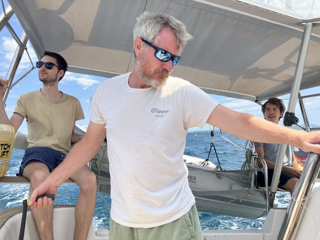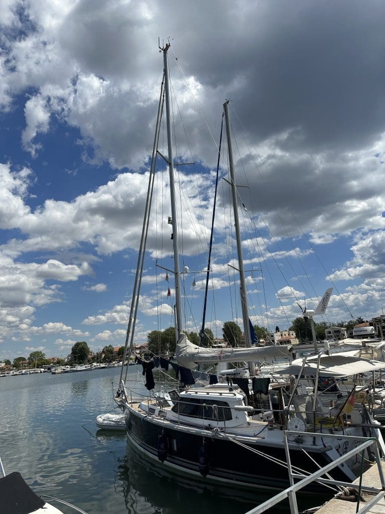 Der Clipper schwimmt wieder im Wasser, ist aufgeräumt und geputzt und wartet auf Filip sowie die neuen Gäste. Porto Lagos liegt in einem Marschgebiet. Brackwasserseen, Flamingos, welche Salinenkrebse mampfen, Sumpf. Ich wurde noch am Nachmittag gewarnt, mich vor den Moskitos in Acht zu nehmen. Bei meiner Ankunft in der Nacht zuvor hatte ich von denen nichts bemerkt und bin daher unvorsichtig. Ich möchte noch einmal durchlüften und öffne die Schiebeluke zum Cockpit.