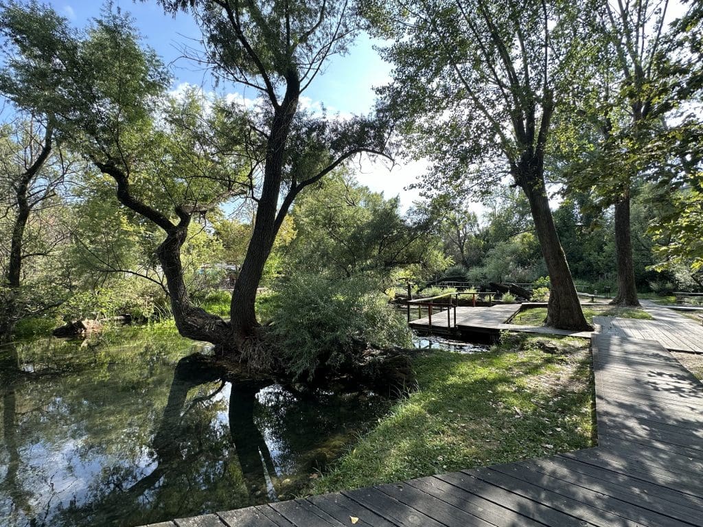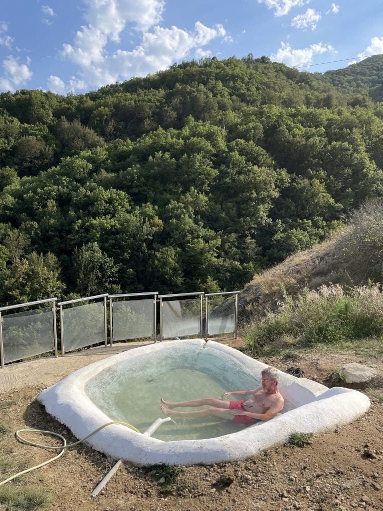 Zurück geht es an einer der heißen Quellen vorbei, die hier mit über 80 °C aus dem Boden sprudeln. Mit europäischem Fördergeld wurde ein kleines Freithermalbad um die Quelle gebaut, in welches wir natürlich hineinhüpfen müssen, auch wenn ich mir nicht gerade klar wird, warm ich bei heißem Wetter nun in heißem Wasser sitze.