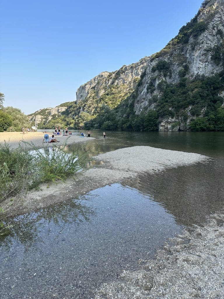 Der erste Stopp erfolgt am Fluss Nestos, an dessen Ufer sich ein Naherholungsgebiet befindet. Die Leute verbringen hier den Tag am Strand, manche campen, das Wasser ist herrlich kalt, erfrischend und die aufragende Felswand gegenüber gewaltig. Filip schwimmt, mir ist es dann doch zu frisch, bis zu den Waden rein hilft auch. Wir wandern ein Stück den Fluss herauf und herunter und fahren weiter.