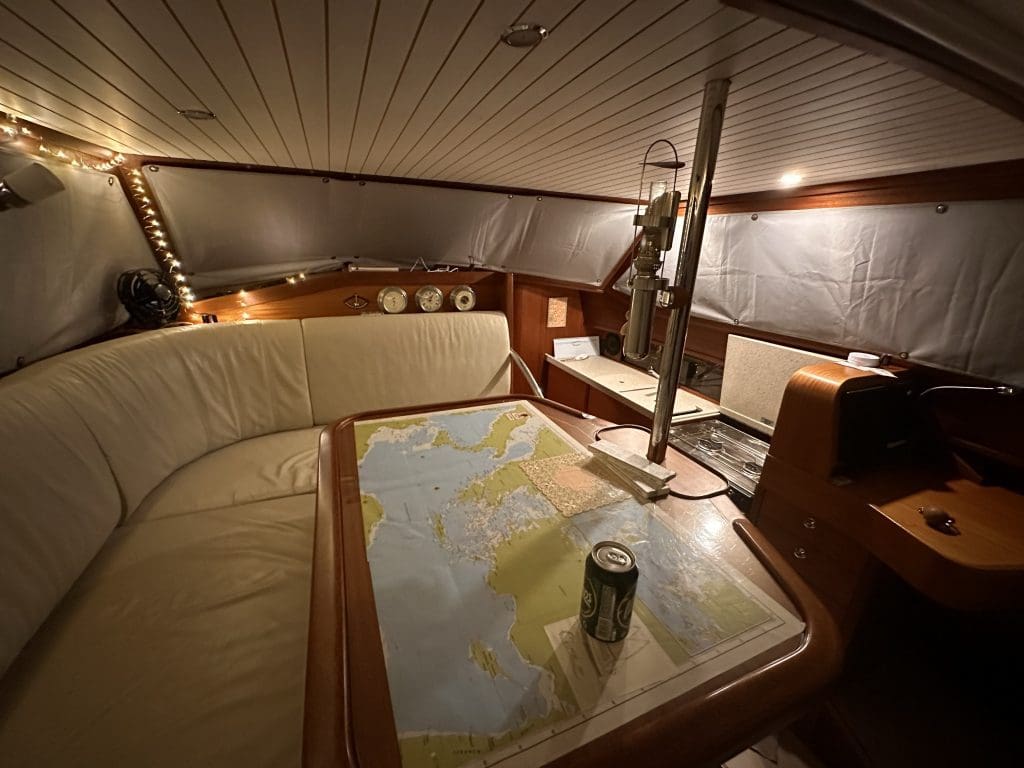 Wir beginnen zu suchen, aber der Ton ist leise und hell und wir bekommen seine Herkunft zunächst nicht lokalisiert. Er kommt irgendwo aus dem Vorschiff. Ich kontrolliere die Bilge im Bad, sie ist furztrocken. Wir öffnen Schränke und Schapps. Der Ton bleibt gleich. Schließlich, nachdem wir bereits anfangen dieselben Orte immer wieder zu kontrollieren, das Piepen aber beständig bleibt, nehme ich die Bodenplatte im Vorschiff auf, in dem nur die Seekarten liegen, die aktuell nicht in Verwendung sind. Und tatsächlich! Unter einem Berg von Seekarten fische ich einen der Wassermelder heraus, den ich dort vor langer Zeit deponiert hatte, und der unter den nun feuchten Seekarten mit schwacher Batterie sein Weh klagt: Meine Füße sind nass, piiiep, meine Füße sind nass, Piiiep…