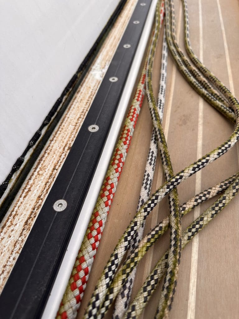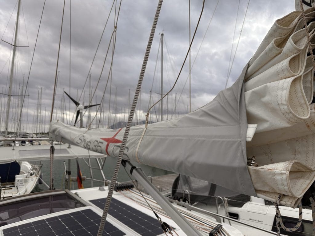 Eine größere Sache steht ebenfalls an. Die Nähte der Lazybags haben so sehr unter UV Licht und Abnutzung gelitten, dass es höchste Zeit wird, diese einer Reparatur zuzuführen. Die Lazybags sind zusammen mit den Lazyjacks ein Segeltuch- und Leinensystem, das zum einen das Großsegel vor UV-Strahlung schützt und zum anderen dasselbe auffängt, wenn man es niederholt.