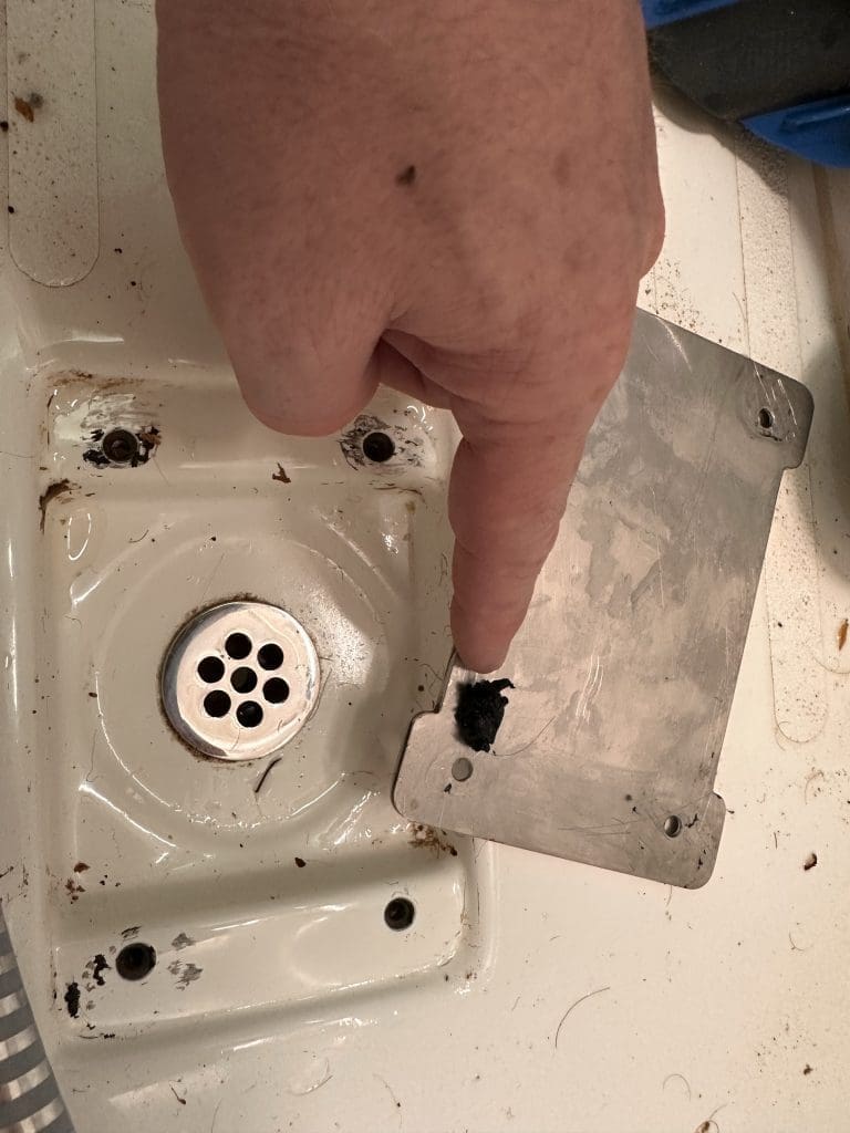 Wieso steht den jetzt da auf einmal Wasser und warum rinnt es sogar nach? Mir kommt die Dusche in den Sinn. Ich öffne dieselbe und siehe da! Dort steht kein Wasser mehr! Es ist, während wir redeten, durch die Bohrlöcher der Bodenplatte des Abflusses eine Etage tiefer in die Bilge geflossen und sucht sich nun dort seinen Weg durch das Boot.