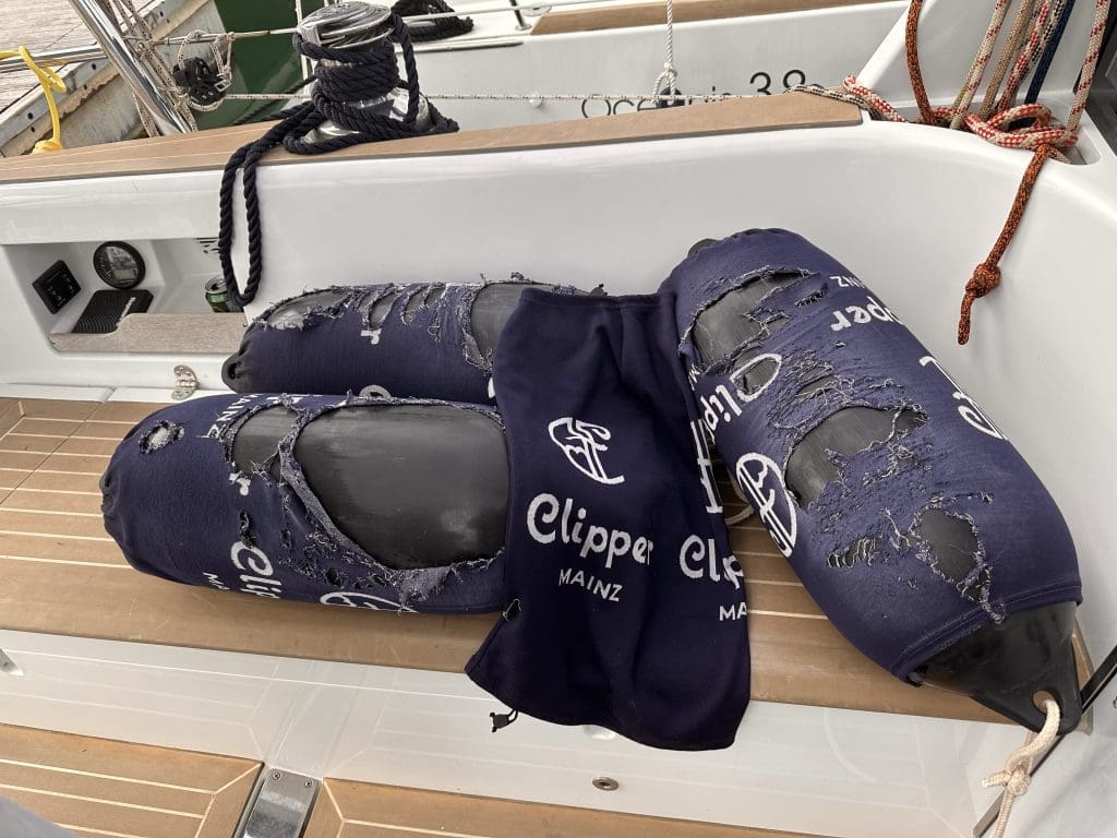 Ich tausche die noch in Argostoli auf Kefalonia geschundenen Fenderkleider aus, die ich neben einigen anderen Dingen aus Mainz mitbrachte.
