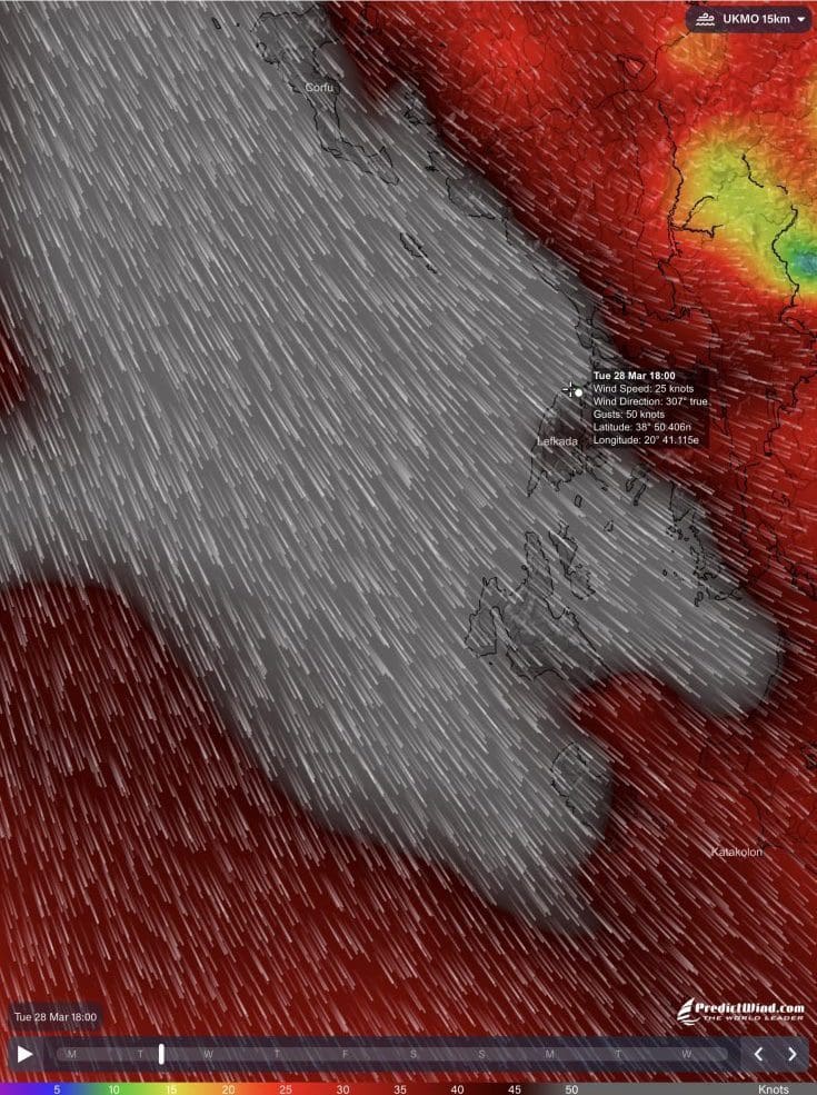 Die draußen auf dem offenen Meer vorhergesagten > 50 Knoten entsprechen schweren Sturmböen. Da will jetzt keiner sein.