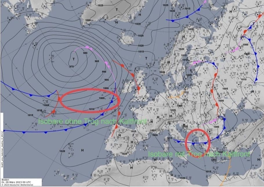 Es handelt sich eine frühzeitig angekündigte Troglage, die wunderbar auf der DWD Bodenanalysekarte ausgebildet ist. Gerade noch in der Theorie auf Malta als Auffrischung behandelt, kommt hier nun ein Trog daher, wie aus dem Bilderbuch. Der Deutsche Wetterdienst erklärt: