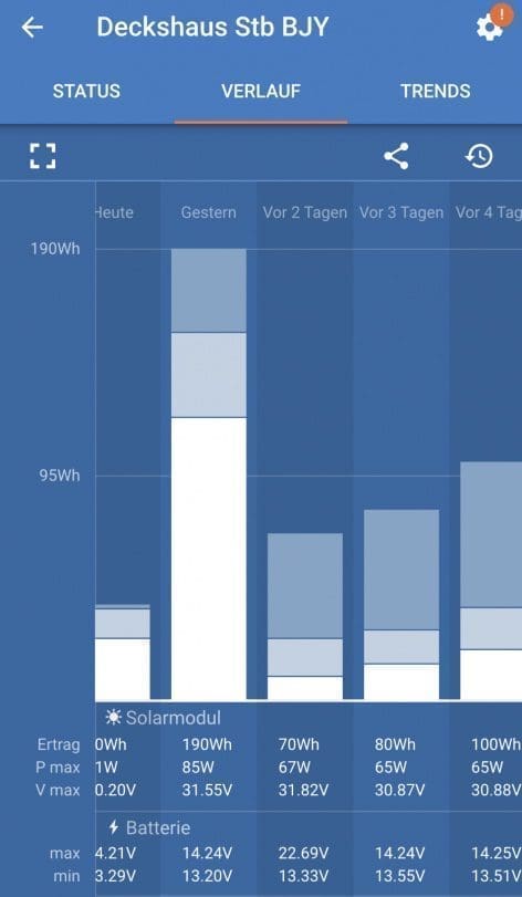 Einige Tage später kann ich an einem Ladegerät in der Historie ablesen, was da in der Spitze an Spannung anlag.