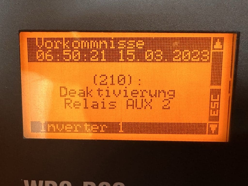 Ich weiß mir nicht zu helfen. Der Alarm bleibt und ich erkenne nur, dass ich zu viel Strom im Netz habe und die Batterien fortwährend abschalten, um sich davor zu schützen. Ich probiere einiges an den Einstellungen, bekomme das Problem aber über die Software nicht in den Griff. Erst die Eingebung, die Sicherung zu ziehen, die ein Relais schaltet, das dann dem System vorlügt, dass die Maschine gar nicht läuft, womit auch kein Strom mehr entgegengenommen wird, führt zur Beruhigung der Lage.