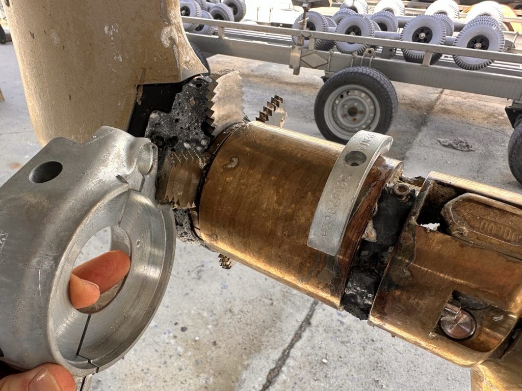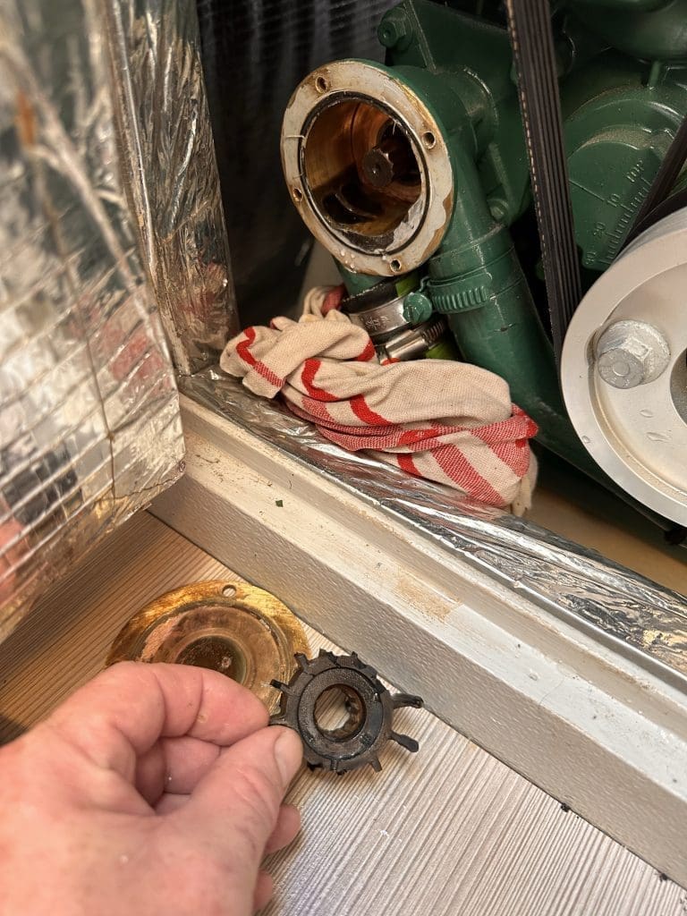 Ich stürze nach draußen, gehe auf Leerlauf und mache den Diesel aus. Der Elektriker schaut mich fragend an und ich erkläre, dass ich gestern bereits das Ventil für den Kühlkreislauf geschlossen hatte. Das ist ihm sicherlich unangenehm, obwohl er ja gar nichts dafür kann. Mir ist es das auch, und ich kann sehr wohl etwas dafür. Ich öffne das Ventil wieder, starte den Motor, aber es kommt kein Kühlwasser mehr aus dem Auspuff. Das war es dann mit dem Testlauf. Er zieht von dannen und ich räume den Technikraum aus, um von dort aus an den Motorraum zu kommen. Schnell ist der Deckel des Impellers geöffnet, der sich trocken laufend wie erwartet, in seine Einzelteile zerlegt hat.