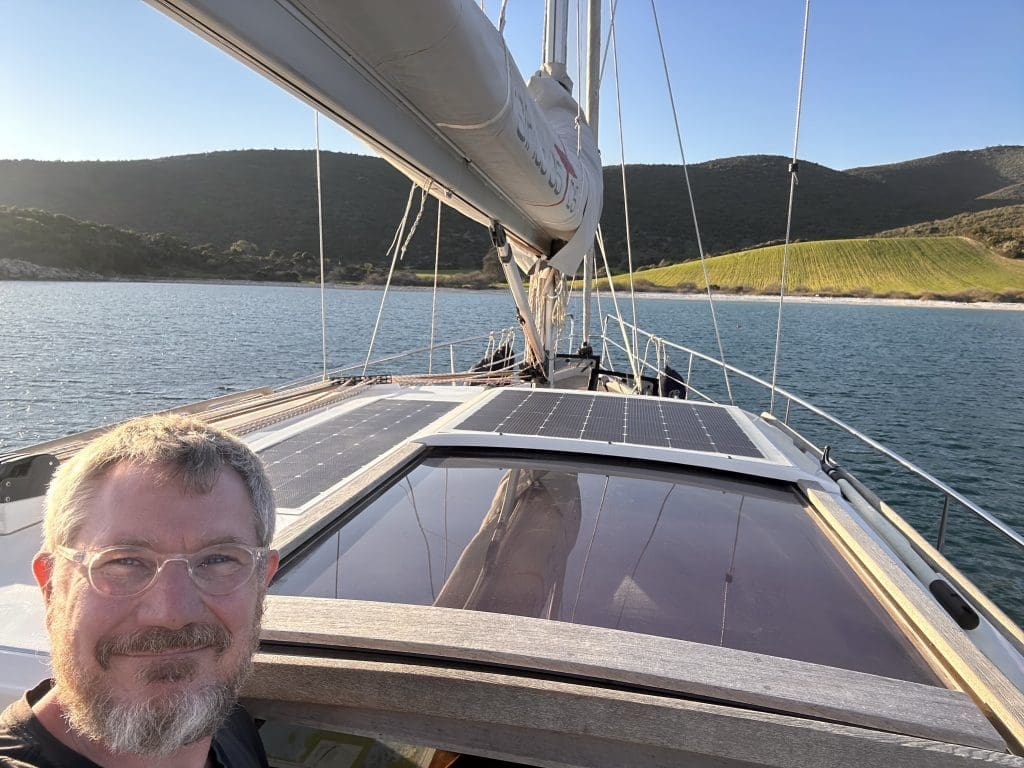 Erneut denke ich mir, dass ich das auch allein und schon vor einer Woche gefunden hätte. Na ja. Ob der Laderegler der Täter oder ein lediglich weiteres Opfer der eigentlichen Ursache war, kann nicht festgestellt werden. Ein Neuer wird aus Athen geordert. Meine Sorge zerstreut sich, dass ich deswegen nicht aus der Marina kann. Lediglich der Motor wird aktuell die Servicebatterien nicht laden. Da aber der Kühlschrank noch nicht geht, habe ich mit den Solarpaneelen mehr als genug Energie. Mittags kommt der britische Nachbar Mike vorbei und zieht mich den Mast hoch, wo ich nach dem Rechten schaue. Es ist für mich das erste Mal in dieser Höhe. Ich nehme mich aber sehr zusammen, konzentriere mich auf das Hier und Jetzt, ignoriere den Abgrund unter mir und schaffe das. Oben ist alles in Ordnung, ich komme, stolz wie Harry, runter und nach 30 Minuten bin ich auch schon ohne viel Federlesen auf dem Weg.