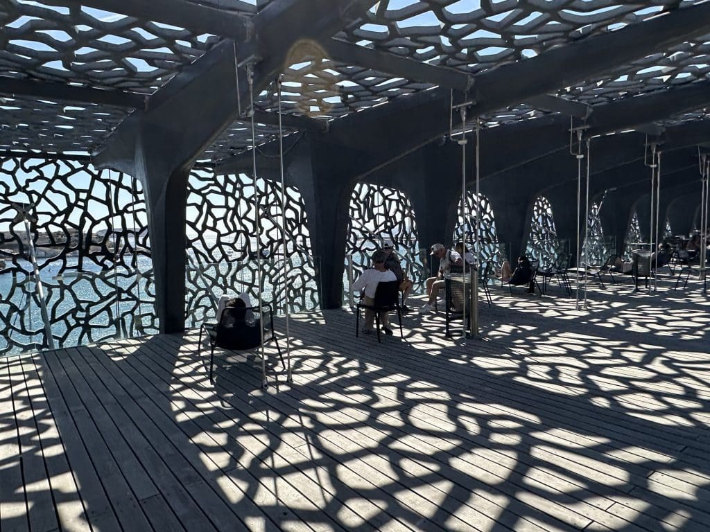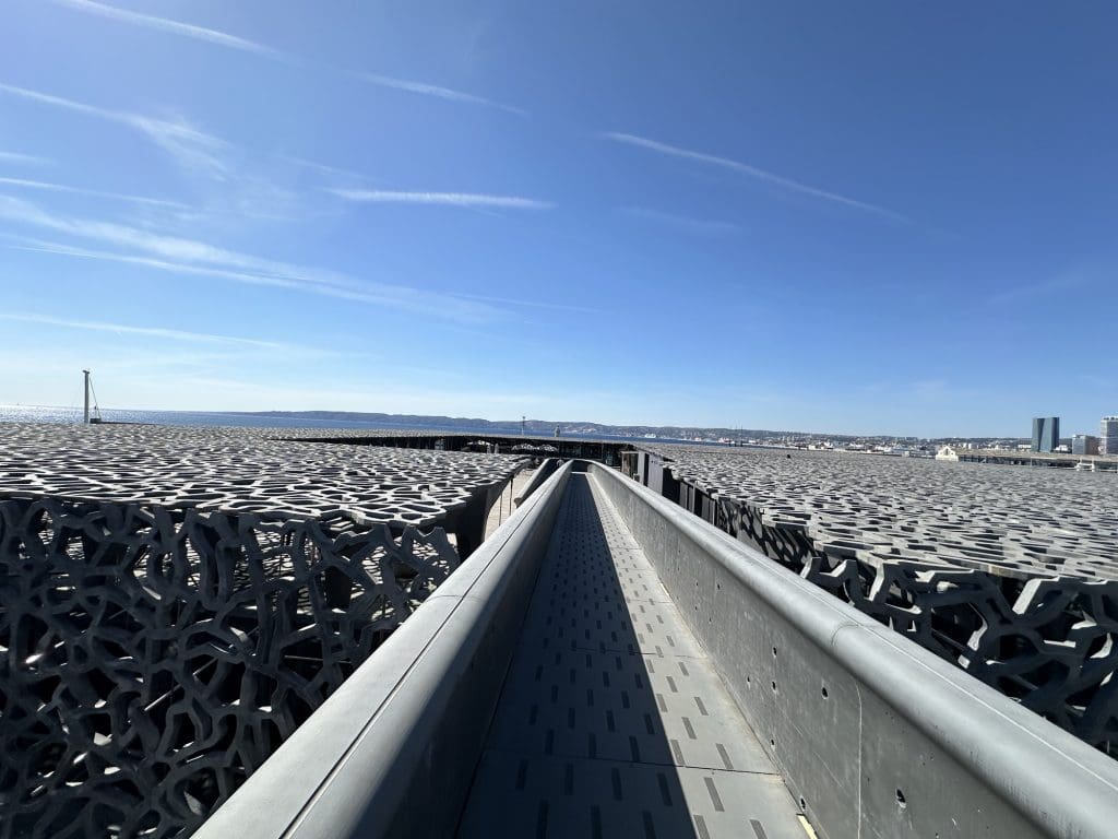 Natürlich ist hier in Marseille der Besuch vieler Musen Pflichtprogramm. Filip arbeitet einen Schlachtplan aus, den es abzuarbeiten gilt. Architektonisch hebt sich das Museum der Zivilisationen Europas und des Mittelmeers spektakulär heraus, da es zum einen im historischen Fort Saint-Jean untergebracht ist, dem majestätischen, die Hafeneinfahrt bewachenden Festungsbau zur rechten auf dem nachfolgenden Bild …