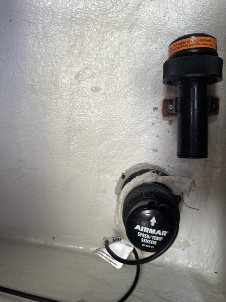 Am Morgen des Fluges muss ich bereits vor 2:30 Uhr aufstehen, um rechtzeitig mit Skooter und Bus am Flughafen zu sein. Das Boot habe ich bereits abgeschlossen, eingemottet. Alle Bordverschlüsse sind zu, so wie ich es auch für eine längere Abwesenheit verlassen würde. Ich stehe nun mitten in der Nacht davor, habe noch etwas Zeit und denke noch kurz darüber nach, was ich dieses Mal trotz Checkliste vergessen haben könnte. Nur aus einem Gefühl heraus und weil ich einfach die Zeit habe, gehe ich noch einmal zurück an Bord, schließe auf, gehe ins Bad und hebe die Bodenplatte, wo ich schon am Vorabend die Logge gegen ihren Dummy getauscht hatte. Die Logge ist ein kleines Schaufelrad, das sich im Wasser dreht und somit die Geschwindigkeit durchs Wasser misst. Ich baue diese bei längeren Standzeiten aus, da sie sonst sehr zuwächst und nicht mehr dreht. Es kommt dann statt der Logge der im Bild befindliche Stopfen in das Loch im Boden, damit das Wasser nicht sprudelnd in das Schiff läuft.