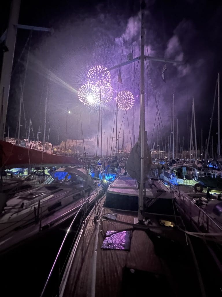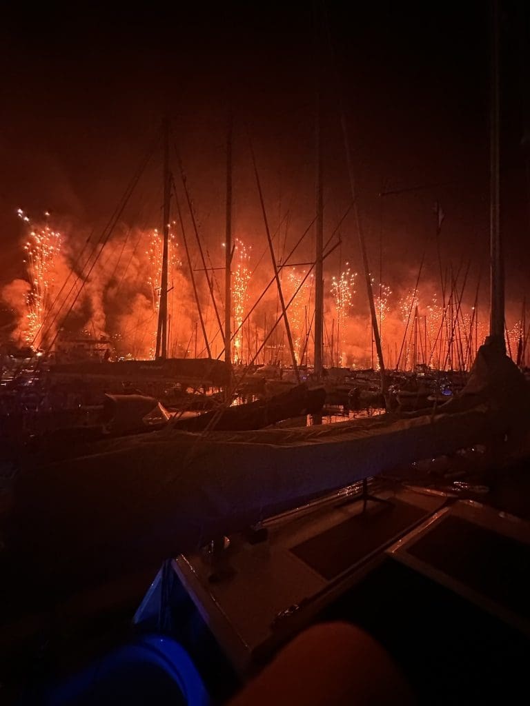 Jedes Boot in der Marina scheint besetzt. Das Feuerwerk wird sowohl von der östlichen Festung, hoch oben über der Hafeneinfahrt abgeschossen, als auch direkt aus dem Hafenbecken, weswegen dasselbe eben gesperrt ist. Da die Boote die Logenplätze sind, nutzen Ihre Eigner sie zusammen mit ihren Freunden als solche auch. Man hat sich den Abend bereits mit dem Verzehr von Häppchen und dem einen oder anderen Gläschen verkürzt und alles wartet nun darauf, dass es losgeht. Ich bin ebenfalls bereit. Ein Stuhl und ein bereits unter Druck befindlicher Wasserschlauch stehen bereit. Letzterer aus dem Gedanken heraus, dass das, was explodierend hochgeschossen wird, brennend auch wieder herunterfallen kann. Die Nachbarn sind ebenso bereit, mit ihrem Schlauch zur Hand.