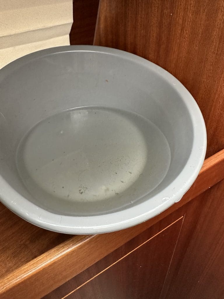 Was für eine genial, pragmatische Idee ich doch hatte; ich muss mich doch mal ausnahmsweise sehr loben. All das Wasser fand seinen Weg nur bis in die Schüssel und nicht weiter in das Boot und auf das gute Holz darunter.