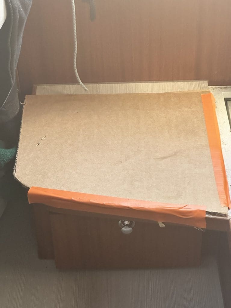 Vorsichtig öffne ich die Tür und schaue am UV Schutz vorbei in das abgedunkelte Innere. Nichts krabbelt, kein Wasser. Ich gehe hinein, öffne ein paar Bodenluken. Immer noch kein Ungeziefer, wovor ich am meisten Bammel hatte. Aber auch Wasser ist nirgendwo, mit einer entscheidenden Ausnahme: Die Dachluke der Mitschiffskabine wurde letztes Jahr undicht, sodass es auch bei normalem Regen schon hineintropfte. In der letzten Stunde vor meinem Aufbruch kam ich noch auf die Idee, eine Schüssel an diese Stelle zu stellen, um die Tropfen aufzufangen, falls das nochmals der Fall sein sollte.
