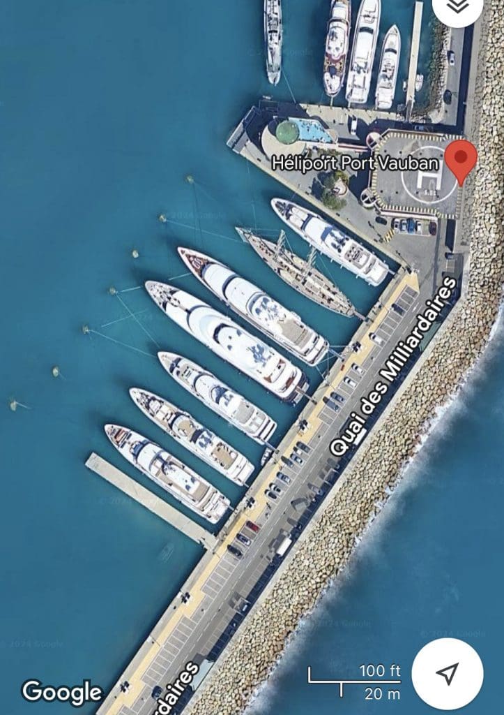 Das ganze ChiChi fällt nicht aus heiterem Himmel. Antibes ist die Heimat vieler Megayachten mit ihren monetär entsprechend ausgestatteten Eignern. Der Kai der Milliardäre ist so in Google Maps zu finden und spricht für sich. Ist das Wasser hier mal für eine besonders große Yacht eines besonders betuchten Scheichs nicht tief genug, wird einfach gebaggert und die Einfahrt vertieft, bis es passt.
